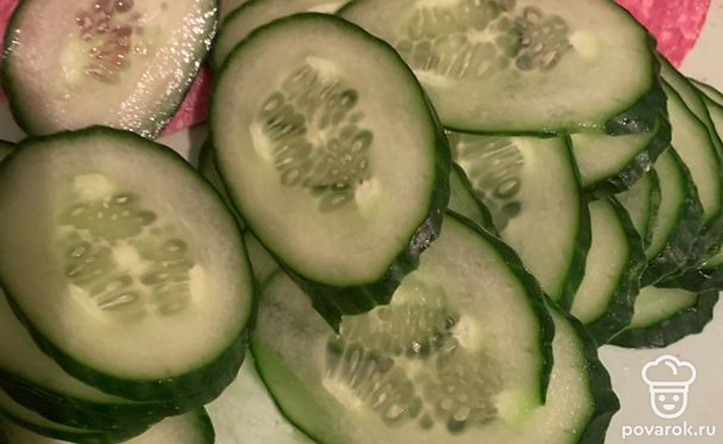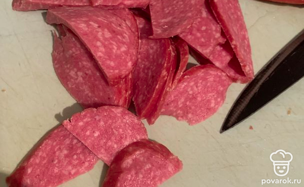 Нарежем тонко колбаску. Поставим вариться яйцо, оно нам понадобится позже.