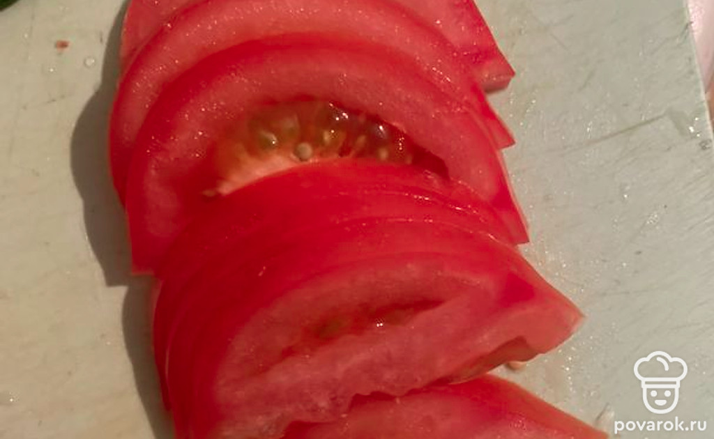 Разрезаем помидор на половинки и так же нарезаем тонкими ломтиками.