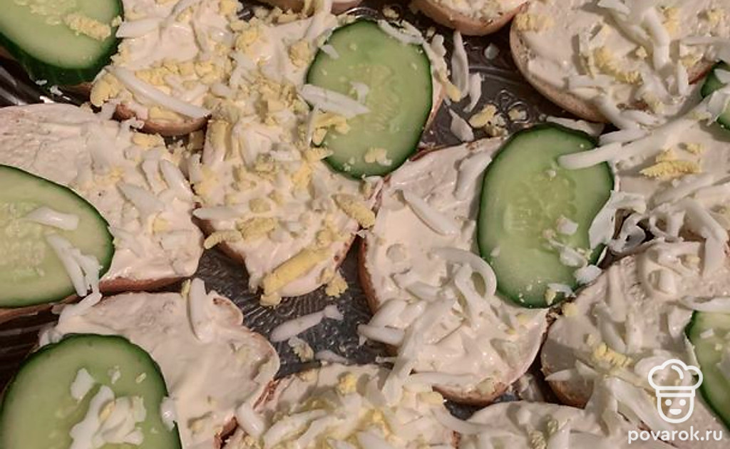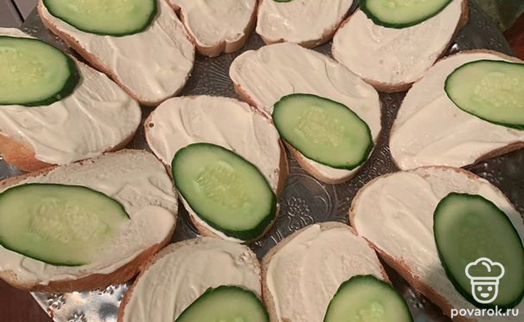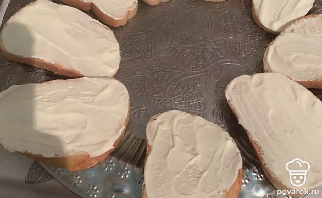 У меня нарезной батон, но можно использовать и багет, и простой батон. На хлеб намазыввем майонез тонким слоем.