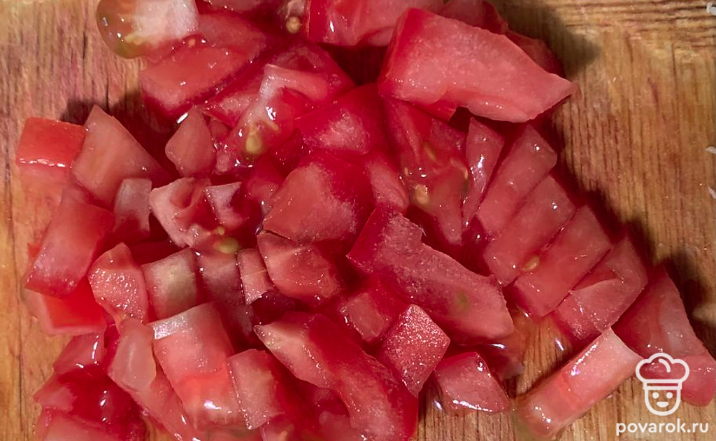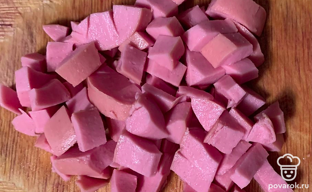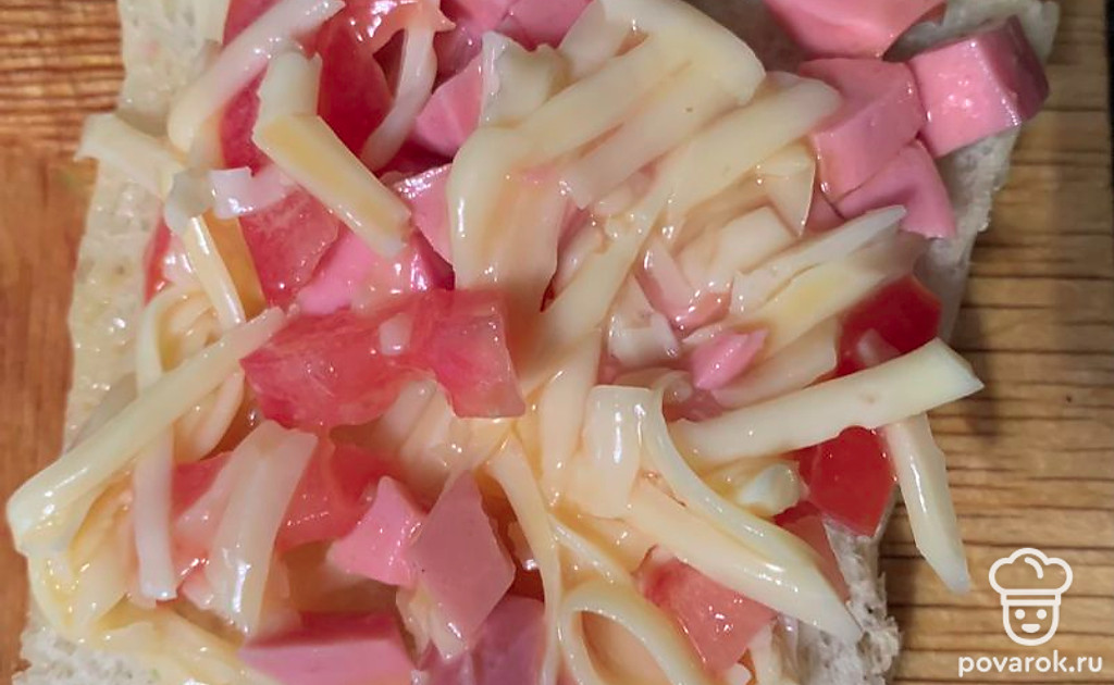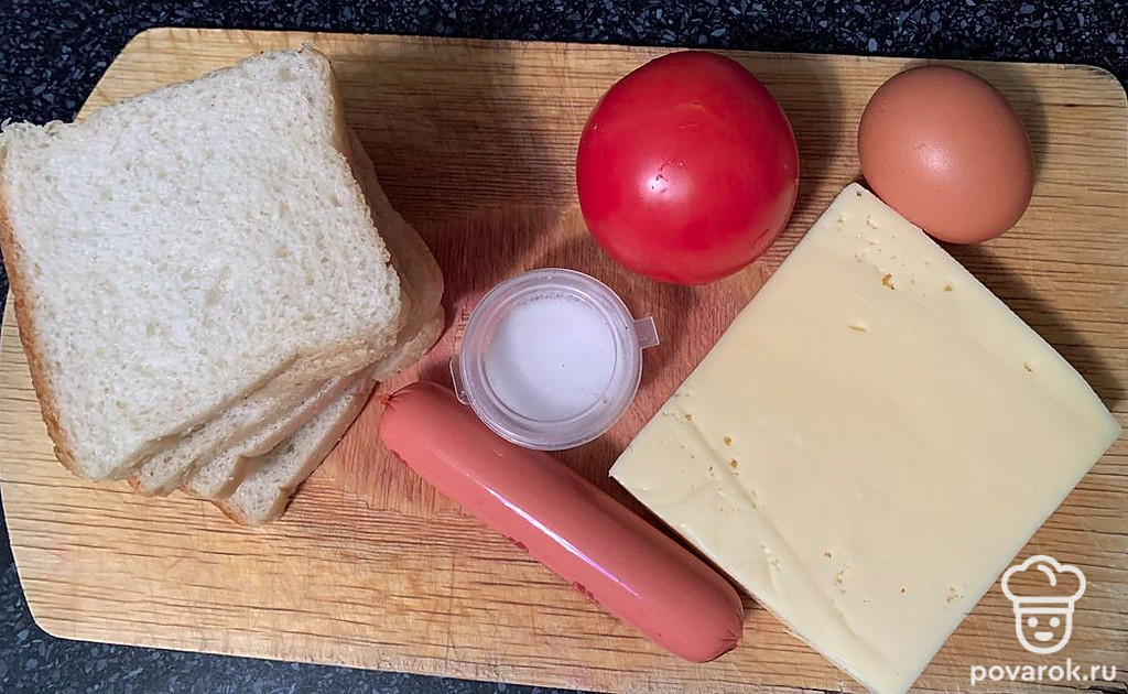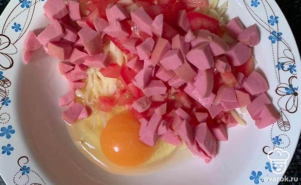 Соединить яйцо, помидор, сыр, сосиски. Посолить и перемешать.