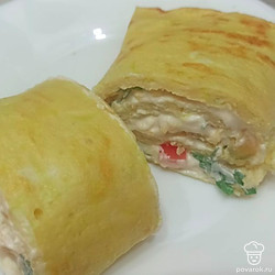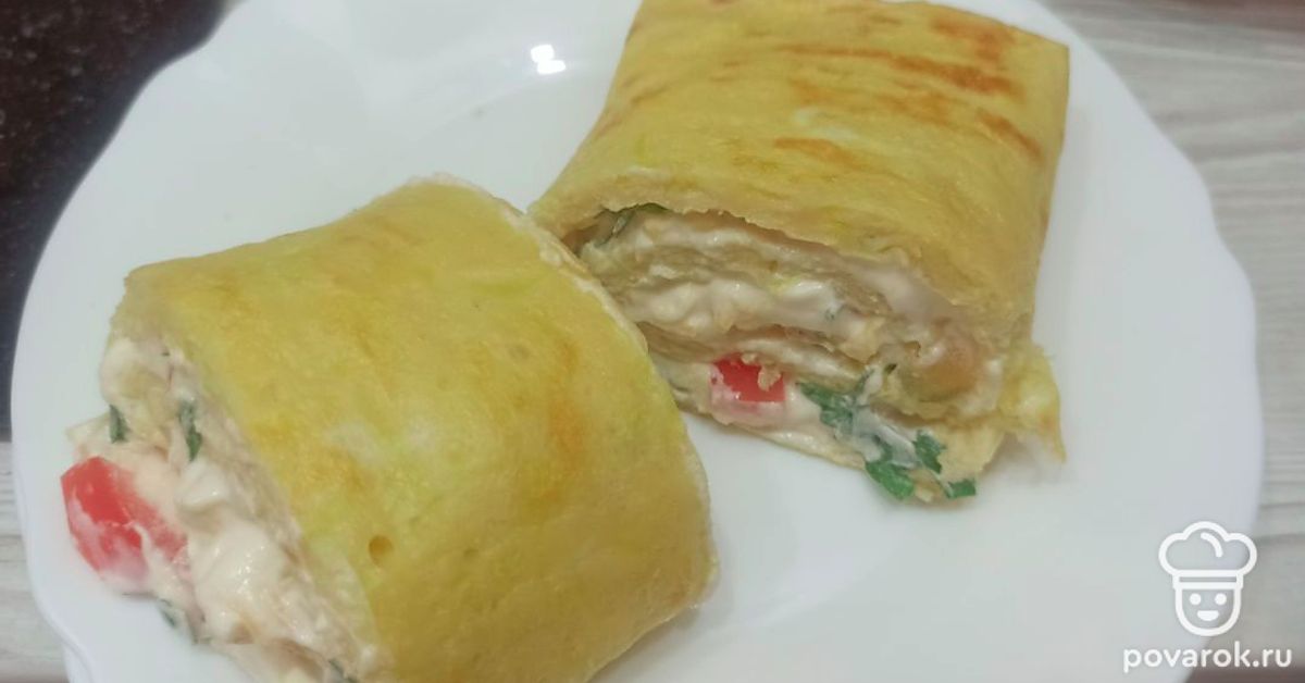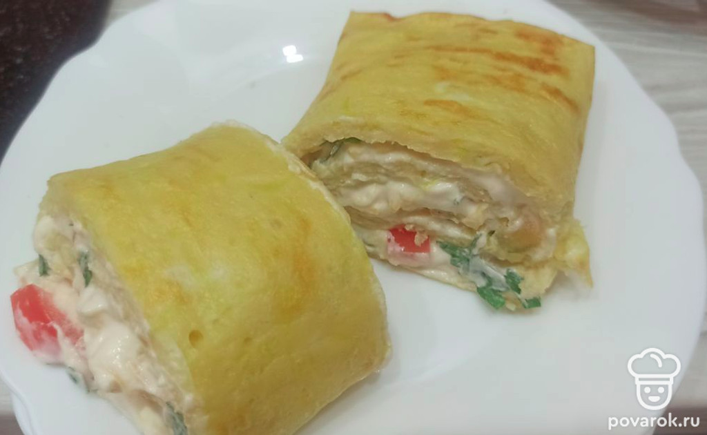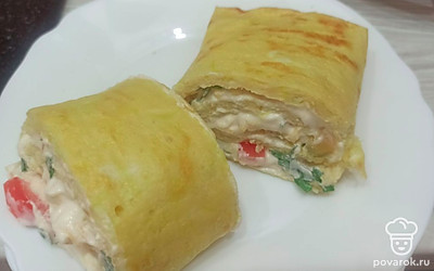 Выкладываем начинку на кабачковый корж и все сворачиваем в рулет.