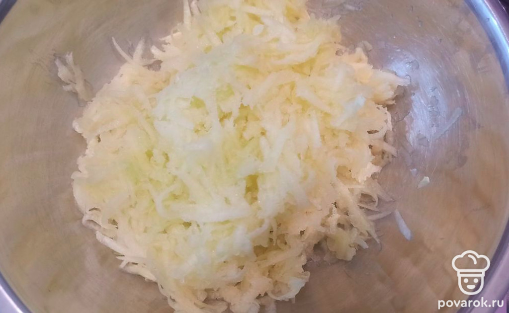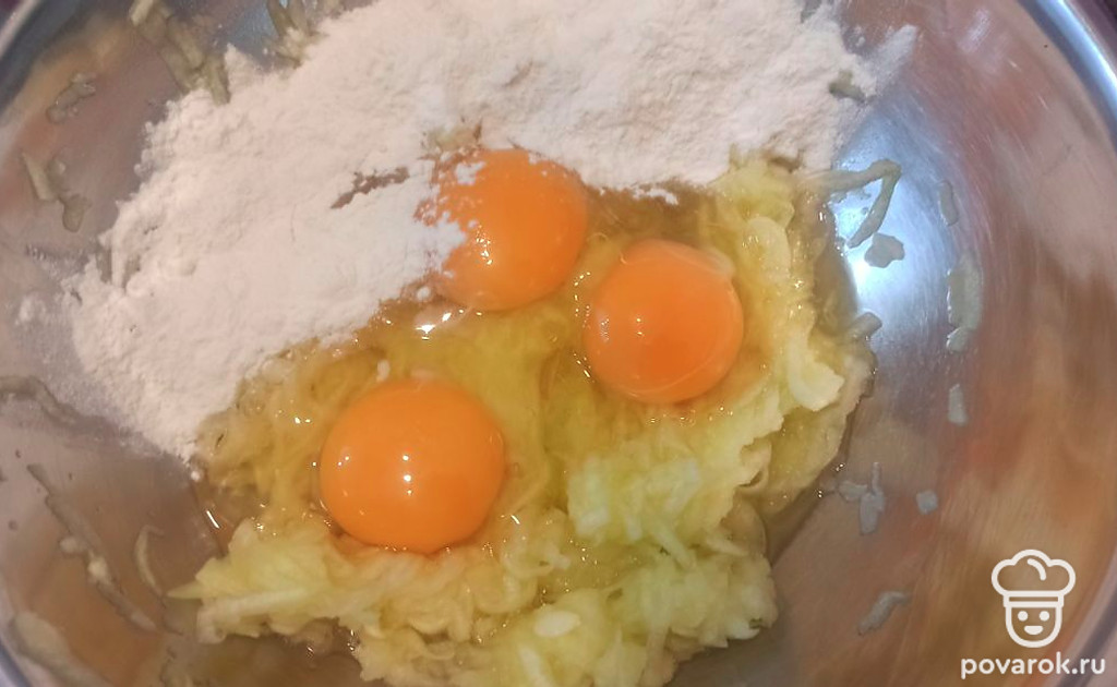 Сливаем жидкость с кабачка, добавляем муку и яйца. Все перемешиваем.