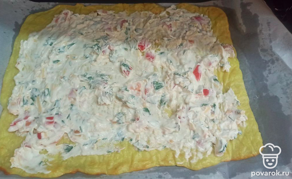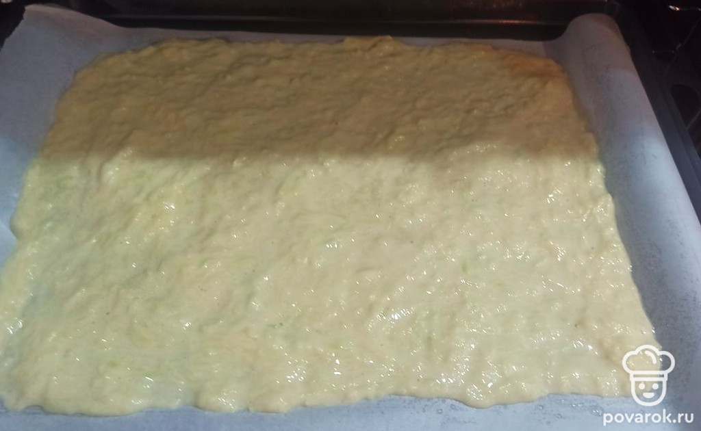 Распределяем тесто равномерно на противене, застеленном пергаментной бумагой. Ставим в разогретую до 180 градусов духовку на 30 минут.
