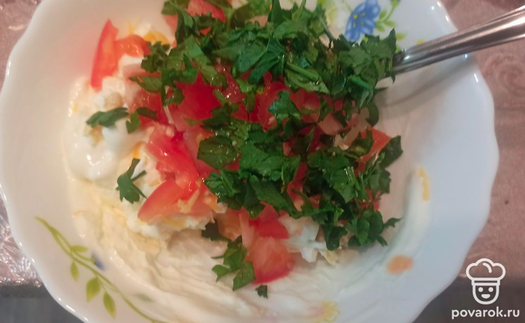Затем в миску выкладываем нарезанный помидор и петрушку. Все перемешиваем.