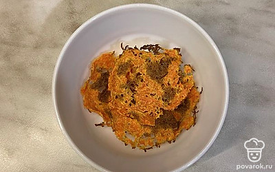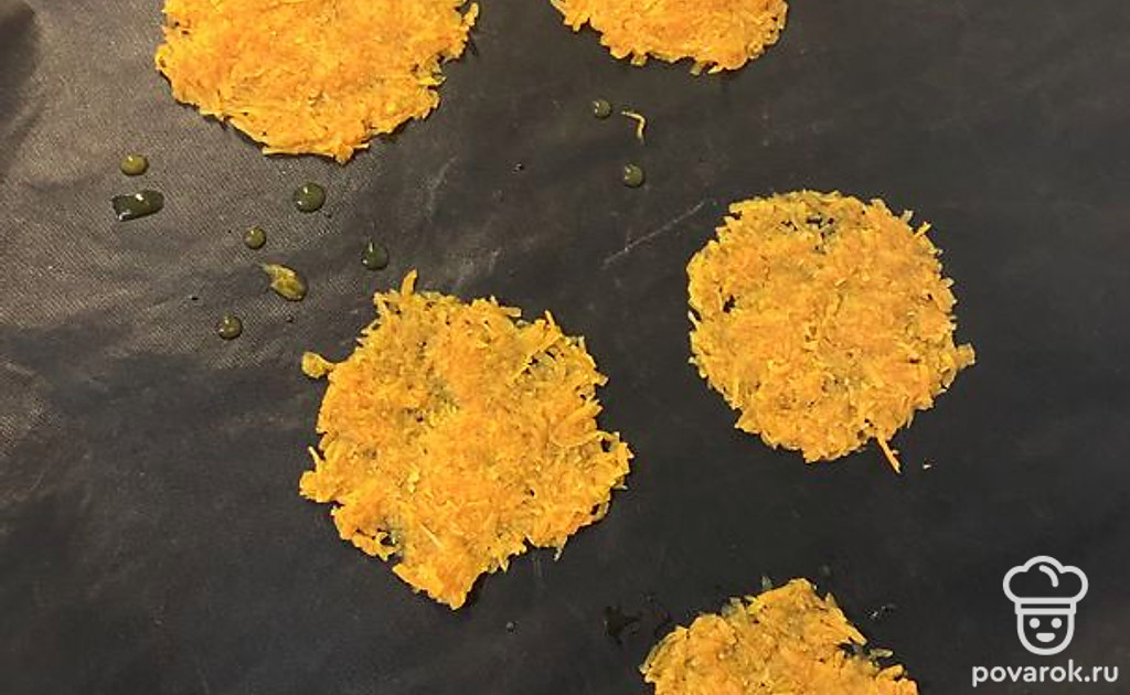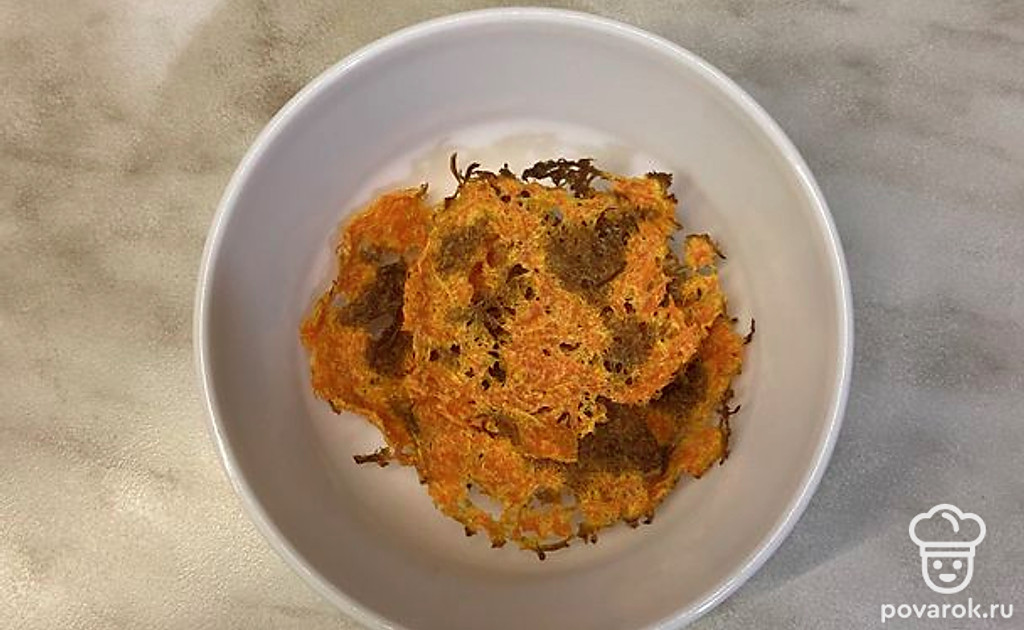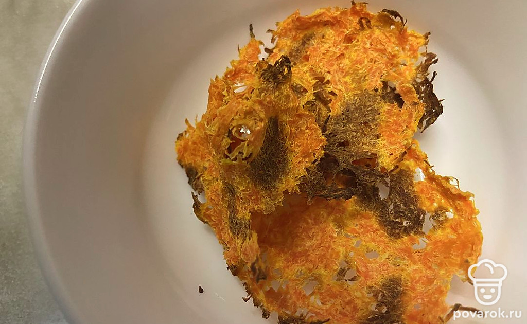 Противень выстелить бумагой. Тонким слоем выложить морковь, предварительно отжав ее. Запекать в духовке при 180 градусах примерно 3-4 минуты.