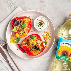 Половинки перцев наполните начинкой и выложите в смазанную маслом форму для запекания. Отправьте в духовку на 50 минут.
