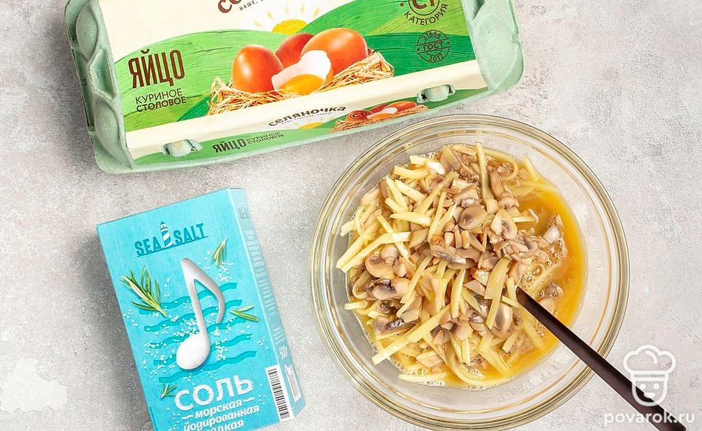 Подготовьте начинку. Шампиньоны Global Village обжарьте на 2 ст.л. масла «Селяночка» до испарения жидкости. Добавьте грибы в картофельную массу. Вбейте яйцо «Селяночка», посолите и поперчите.
