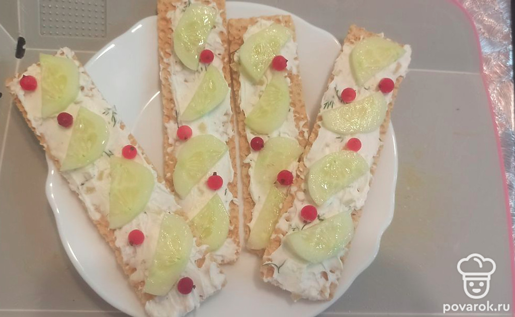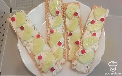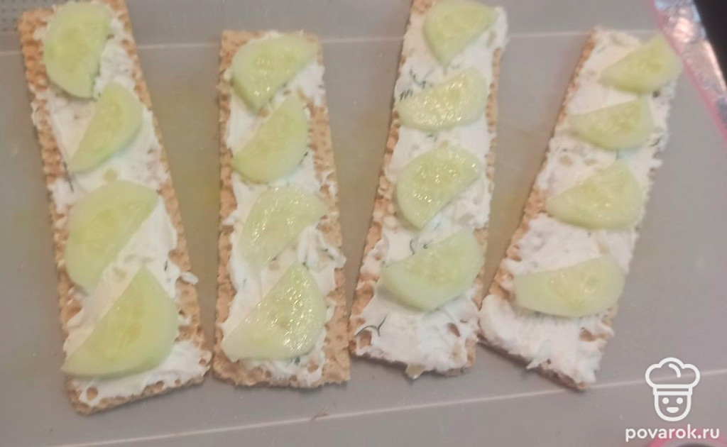 Чистим и нарезаем огурец, раскладываем поверх соуса.