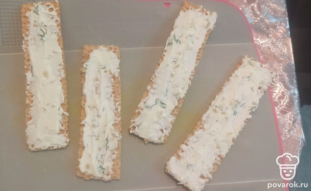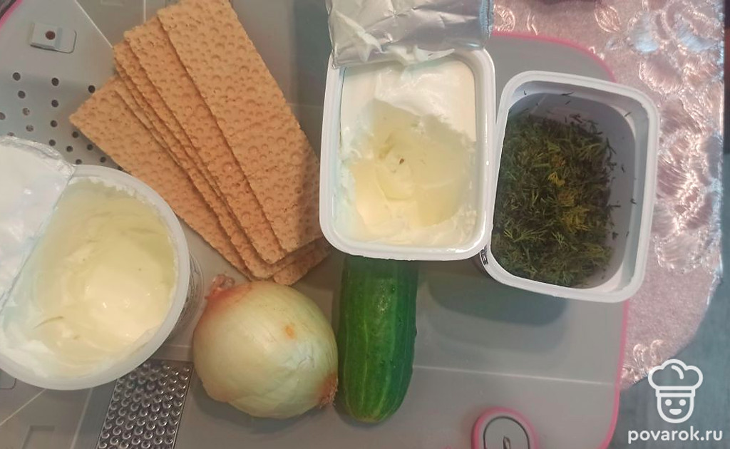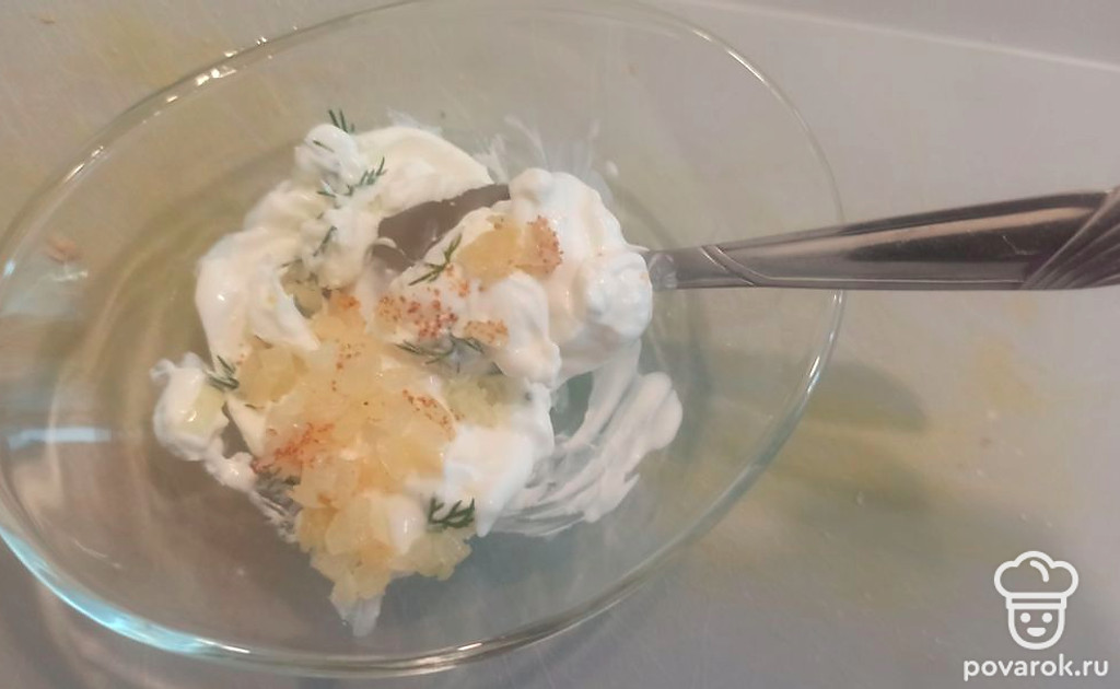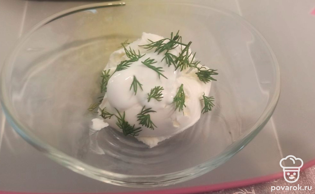 В соуснике смешиваем творожный сыр, сметану и измельченный укроп.
