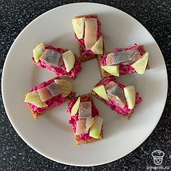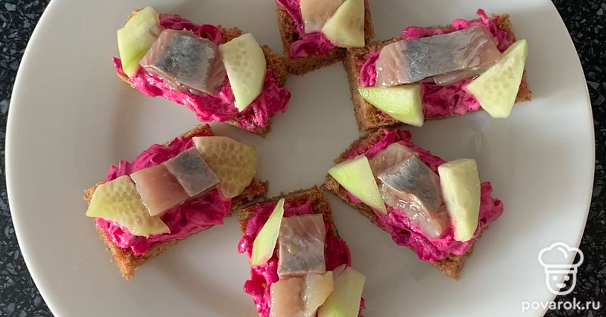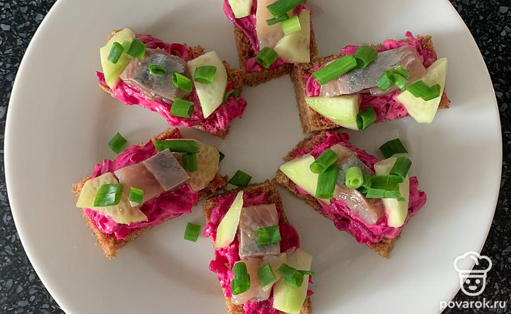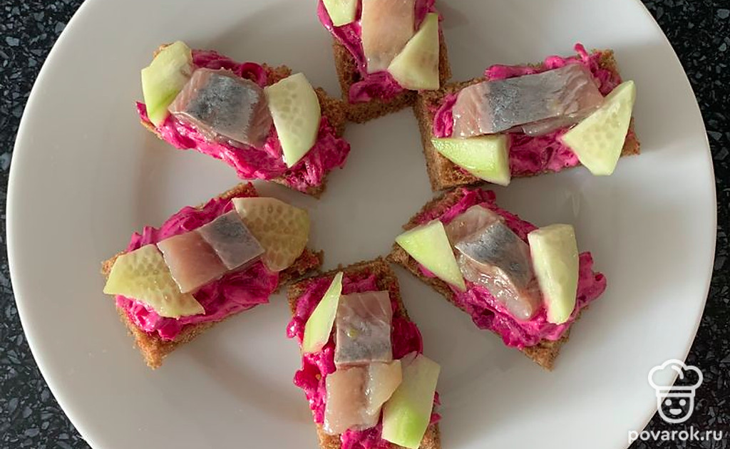 Сверху выложить кусочки селедки и огурца. Бутерброды готовы.