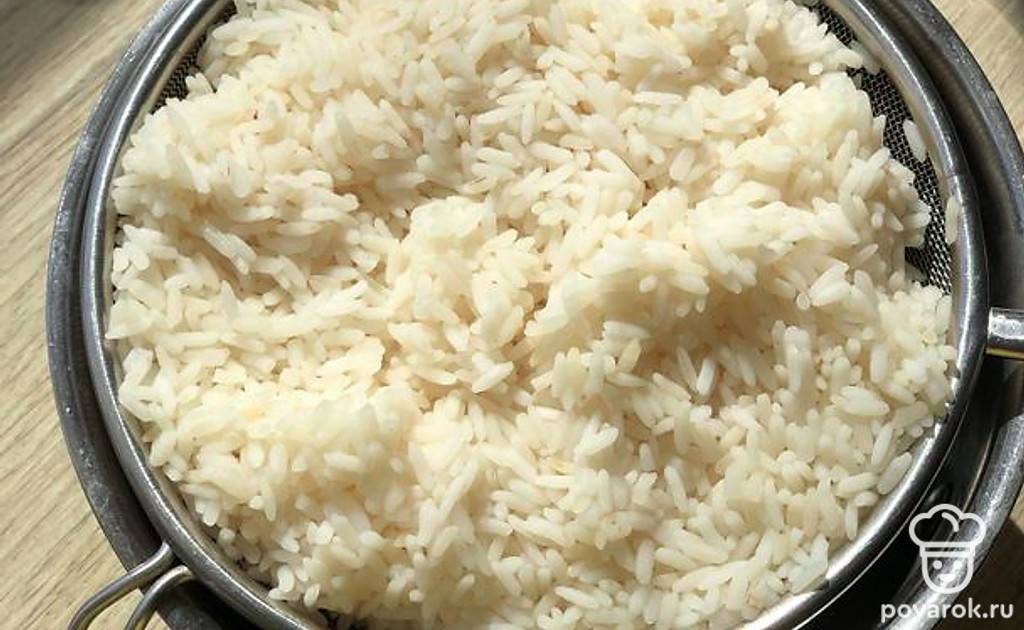 Рис отварить до полуготовности, откинуть на дуршлаг, чтобы стекла лишняя вода.