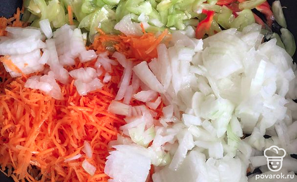 Лук и морковь помыть, почистить. Морковь натереть на терке, лук и хвостики от перца нарезать мелким кубиком. Обжарить до золотистого цвета на растительном масле.