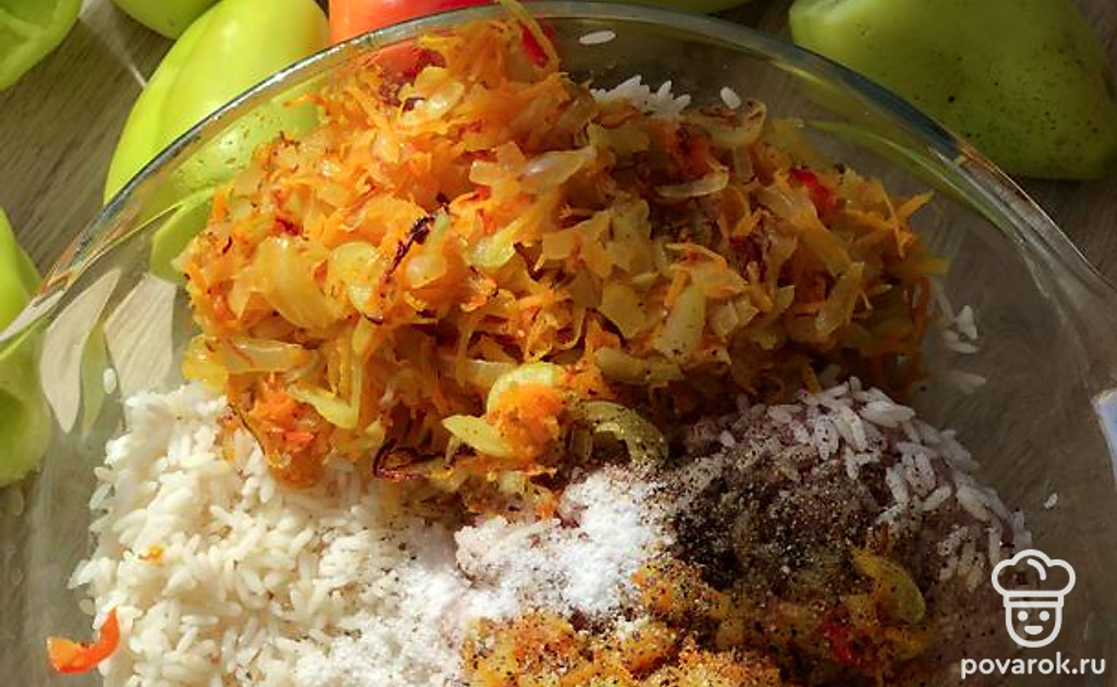В глубокой миске смешать пережарку, фарш, рис. Посолить и поперчить.