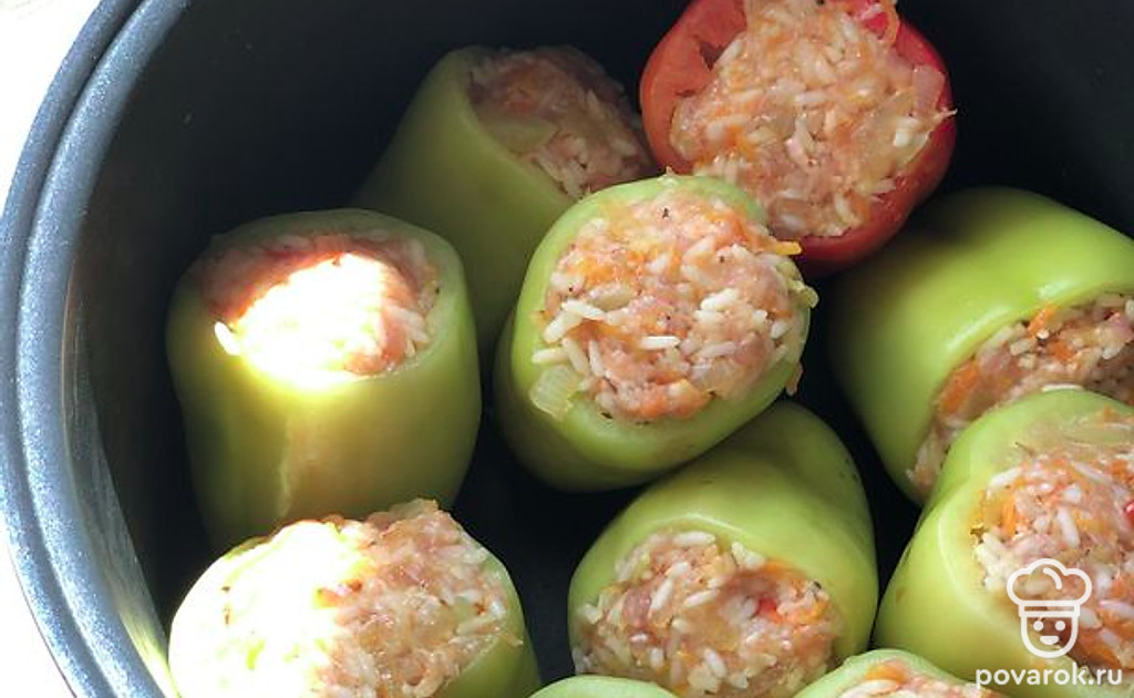Начинить перец. Выложить в глубокую кастрюльку или чашу мультиварки.