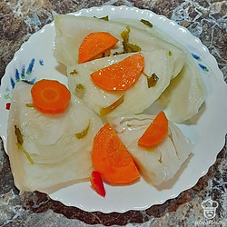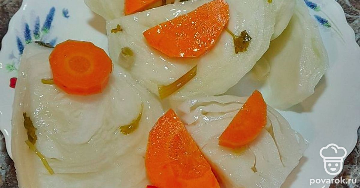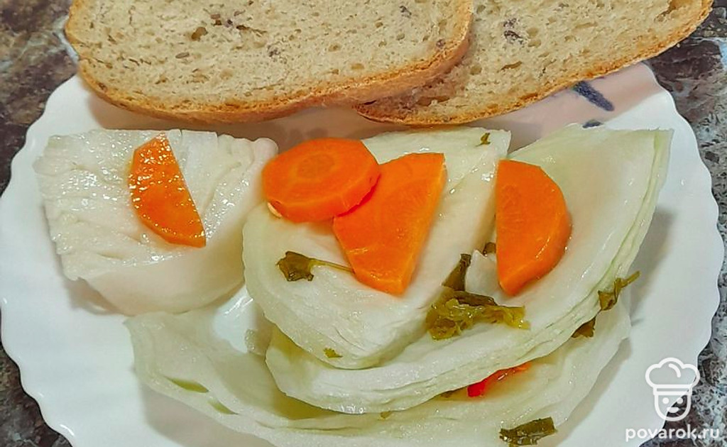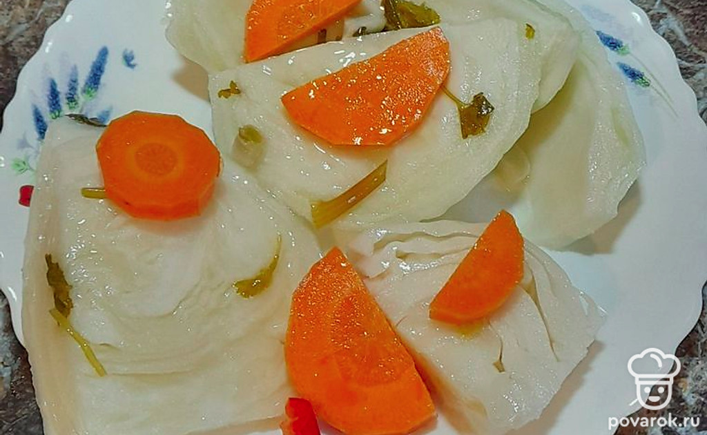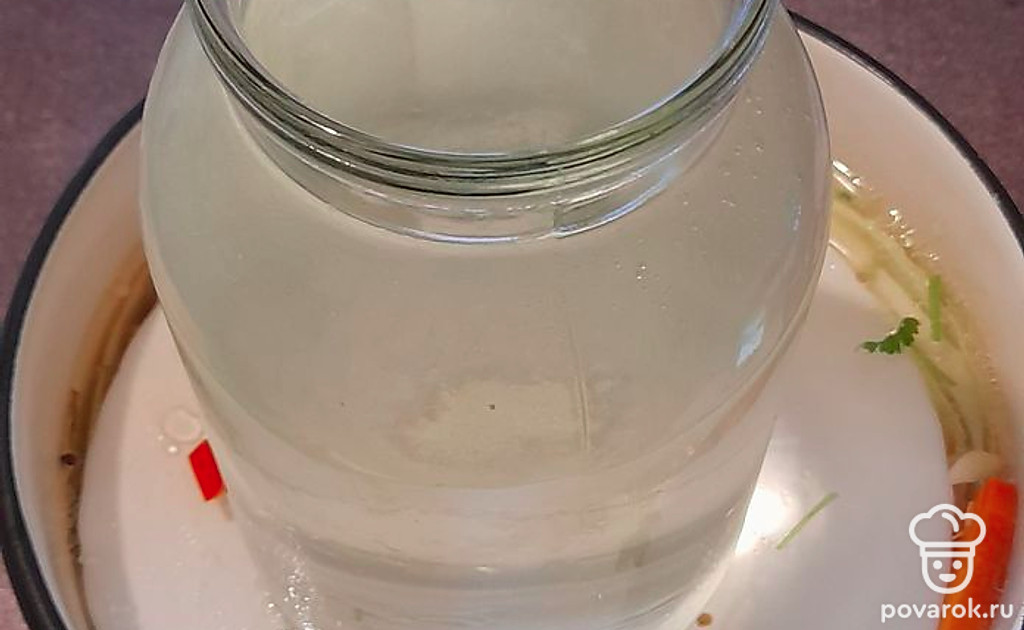 Залить кипящим рассолом капусту, чтобы он ее покрывал. Положить плоскую тарелку и поставить гнет (можно в литровую банку налить воду). Оставить на ночь на кухне. Утром можно убрать банку и поставить закуску в холодильник. Готово.