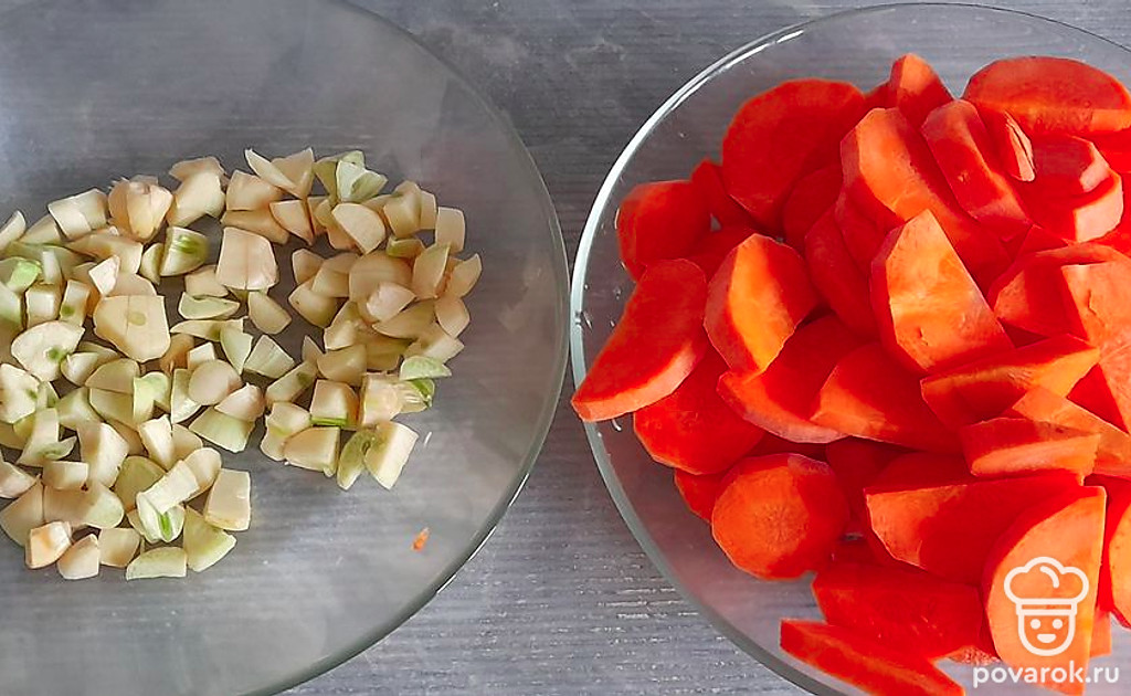 Морковь нарезать кружочками. Чеснок разрезать пополам.