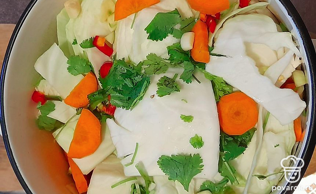 Выложить в глубокую кастрюлю слоями — капуста, морковь, кинза, перец, чеснок. И так далее, пока не закончатся все ингредиенты.
