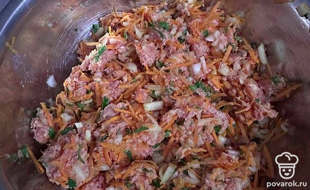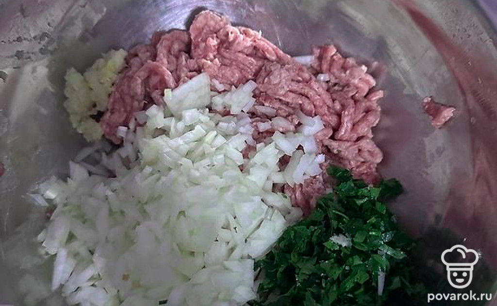 Фарш перемешиваем с нарезанным луком и зеленью.