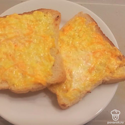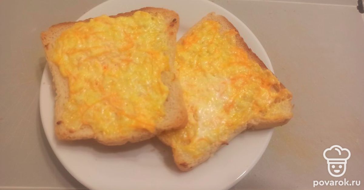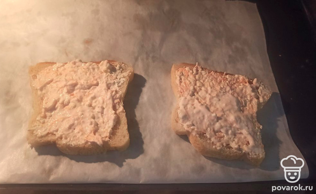 Выкладываем начинку на хлеб и ставим в разогретую до 180 градусов духовку на 15 минут.
