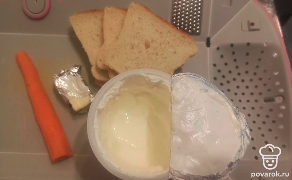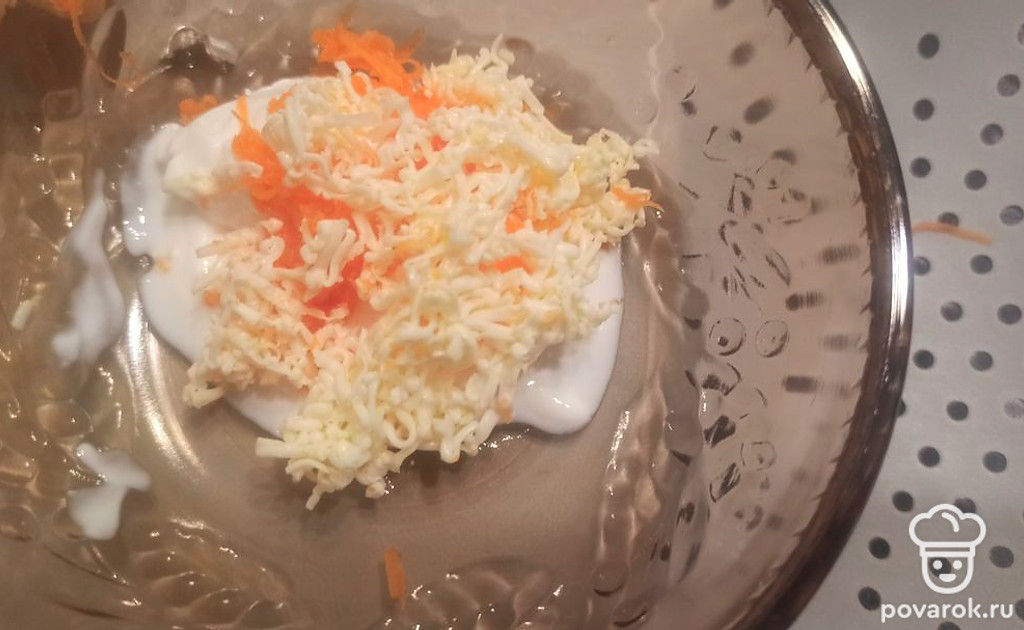Морковь и сыр натираем на мелкой терке. Смешиваем со сметаной.