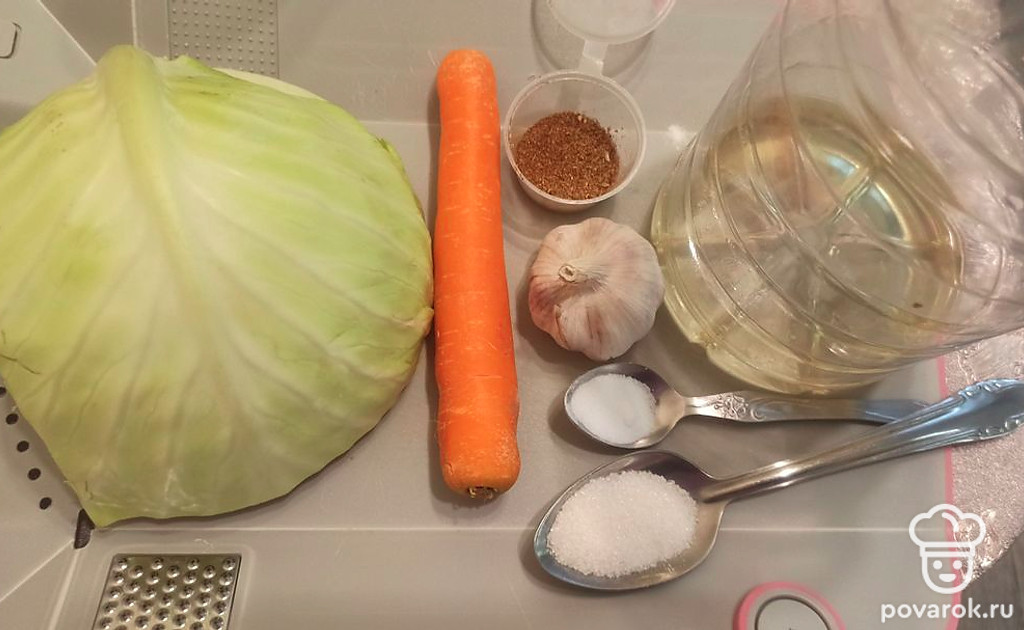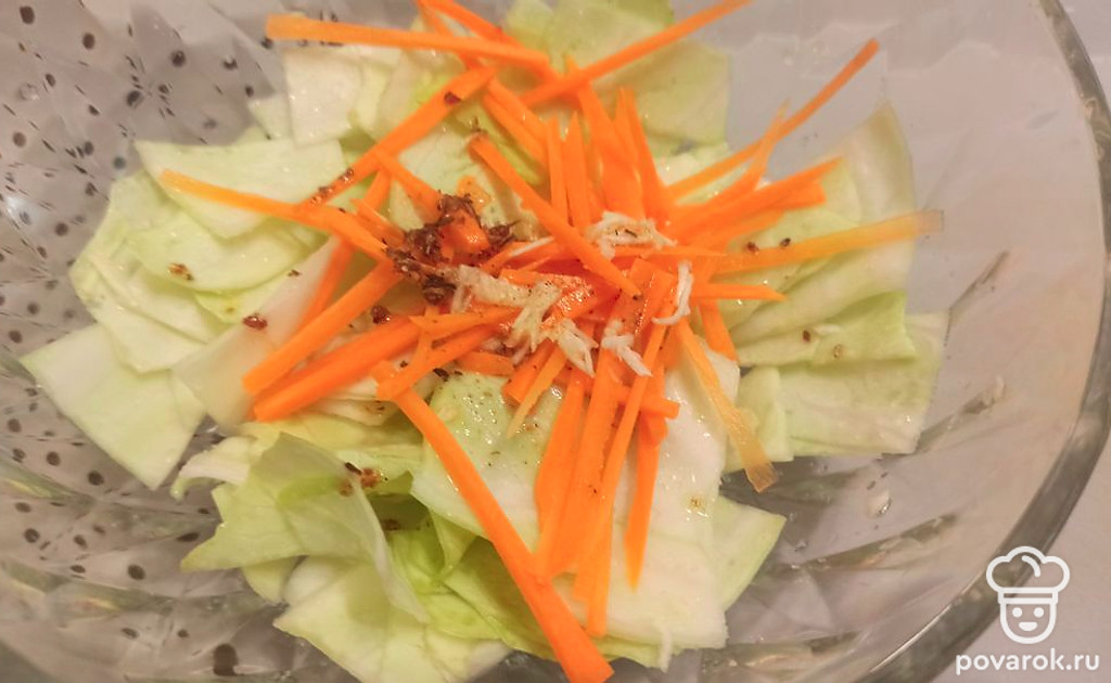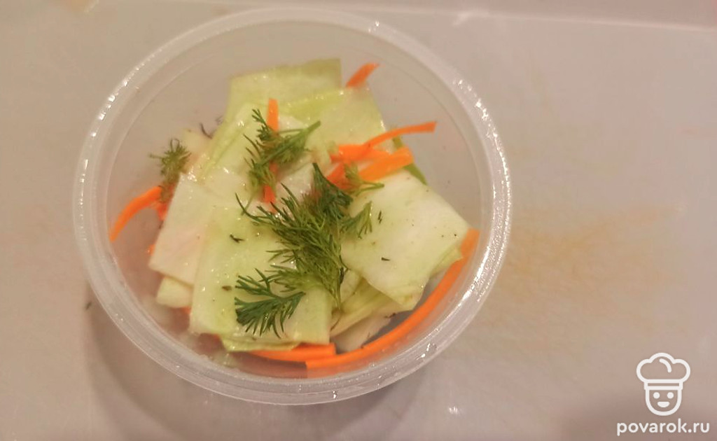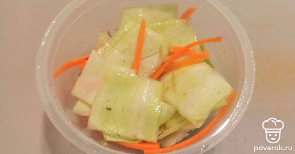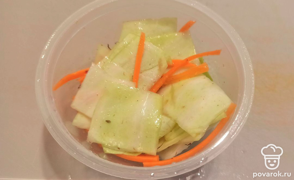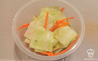 Поливаем капусту и морковь маслом со специями, все перемешиваем. Даем постоять при комнатной температуре 5 часов.