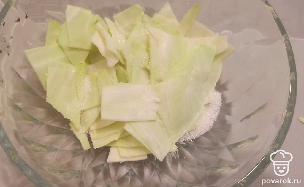 Капусту нарезаем большими кусочками и засыпаем солью и сахаром.