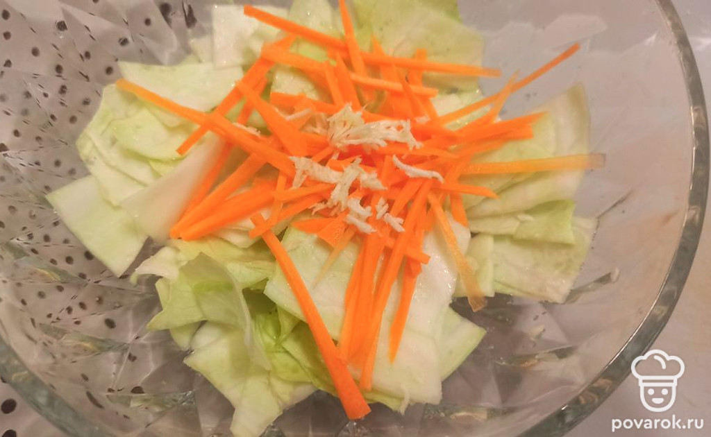 Морковь нарезаем тонкой соломкой, чеснок натираем на мелкой терке.