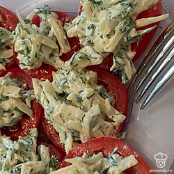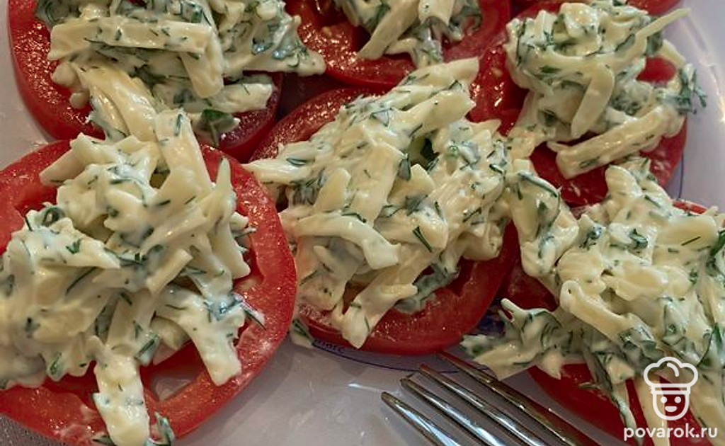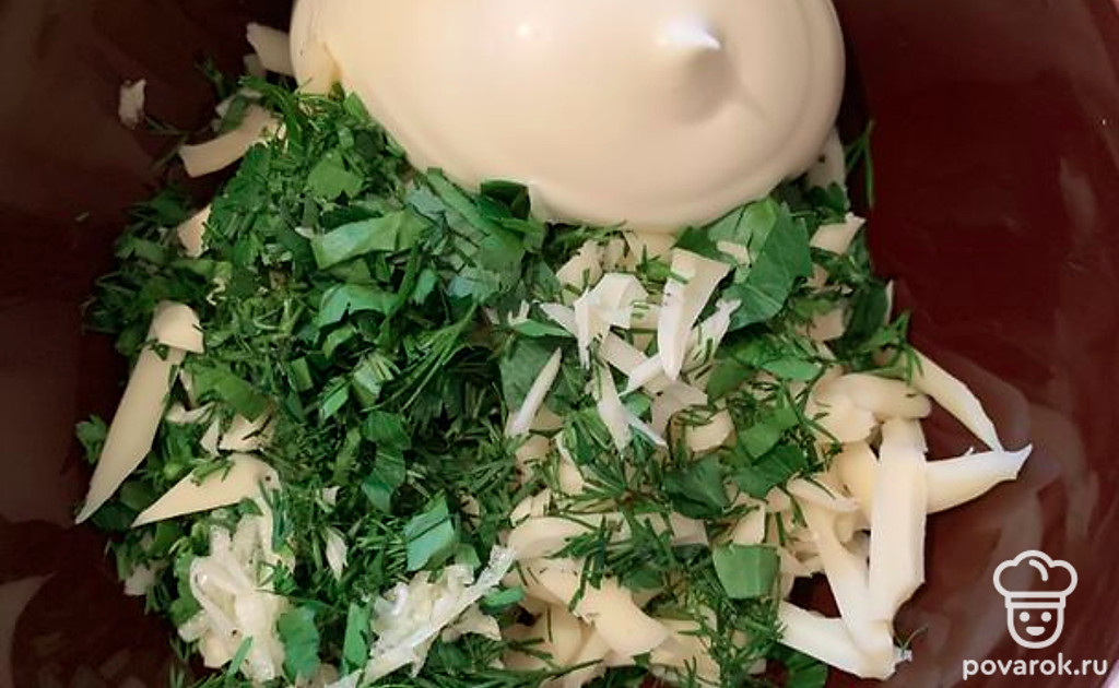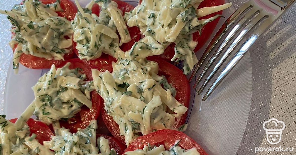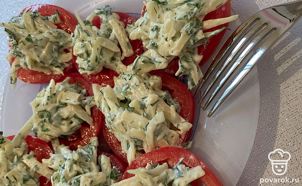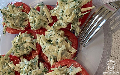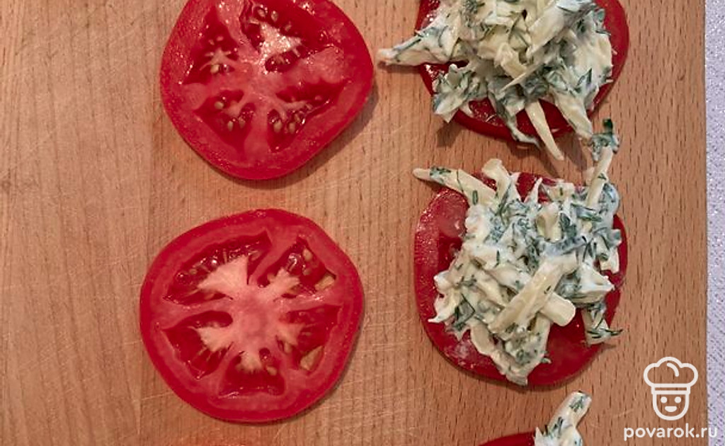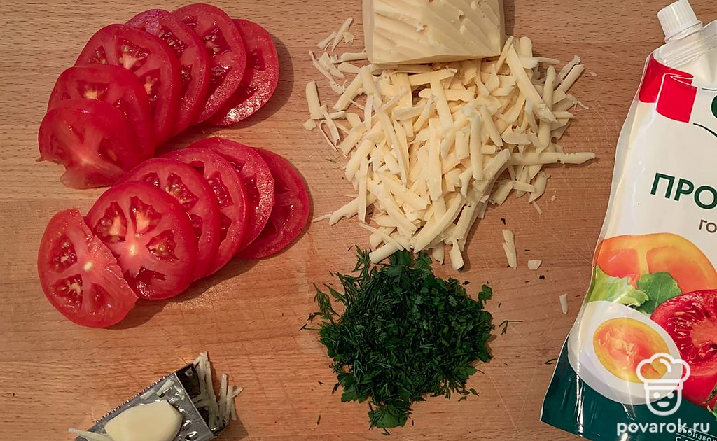 Помидор нарезать кольцами толщиной 3-4 миллиметра. Чеснок натереть на мелкой терке, зелень мелко порубить, сыр натереть на крупной терке.