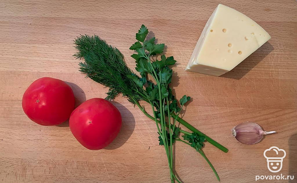 Помидор и зелень промыть проточной водой, чеснок очистить.