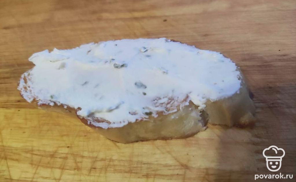 Натрите хлеб чесноком с обеих сторон, намажьте сверху сыром.