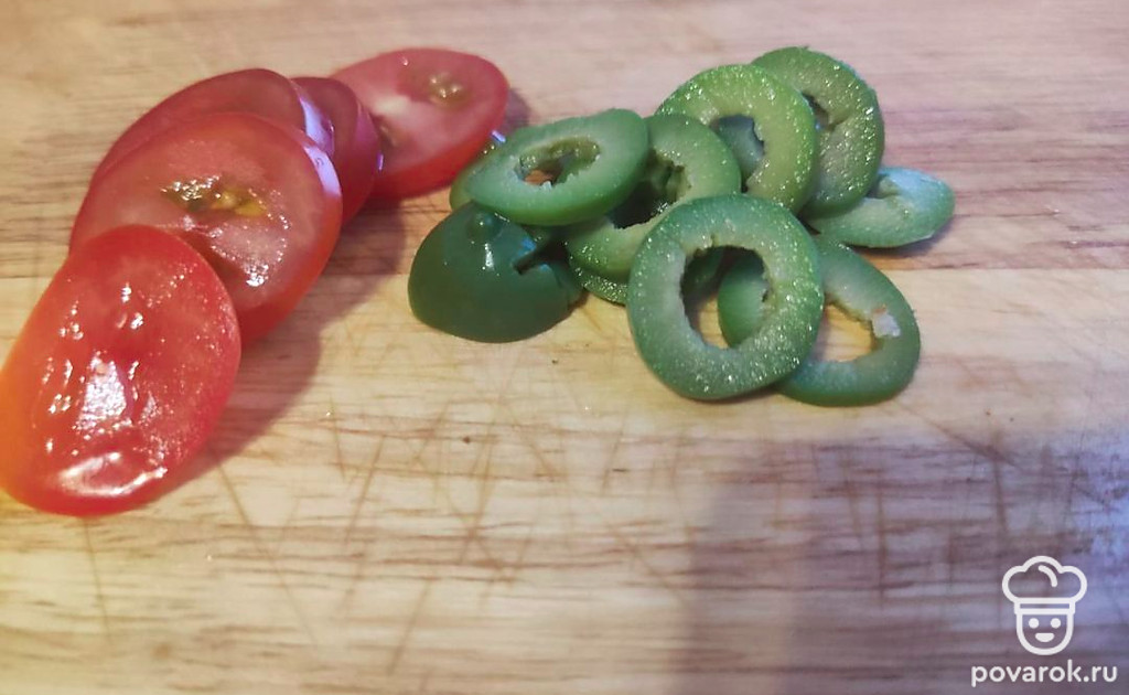 Нарежьте томаты и оливки колечками. Выложите на сыр слоями сначала помидоры, затем оливки.