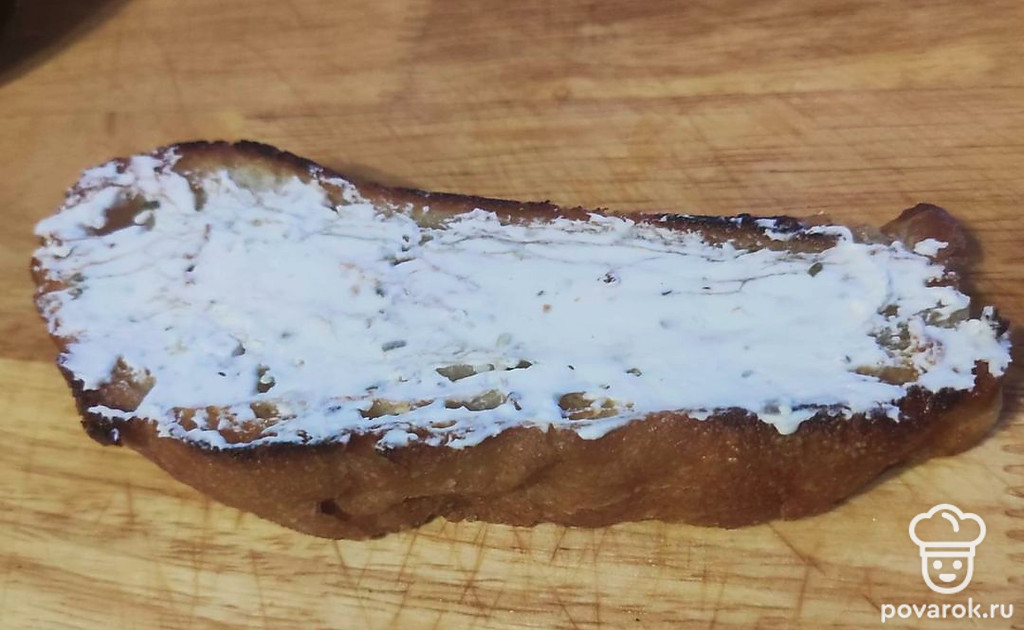 Натрите хлеб с обеих сторон чесноком и сверху намажьте сыром. Уложите огурчики и выложите шпроты.