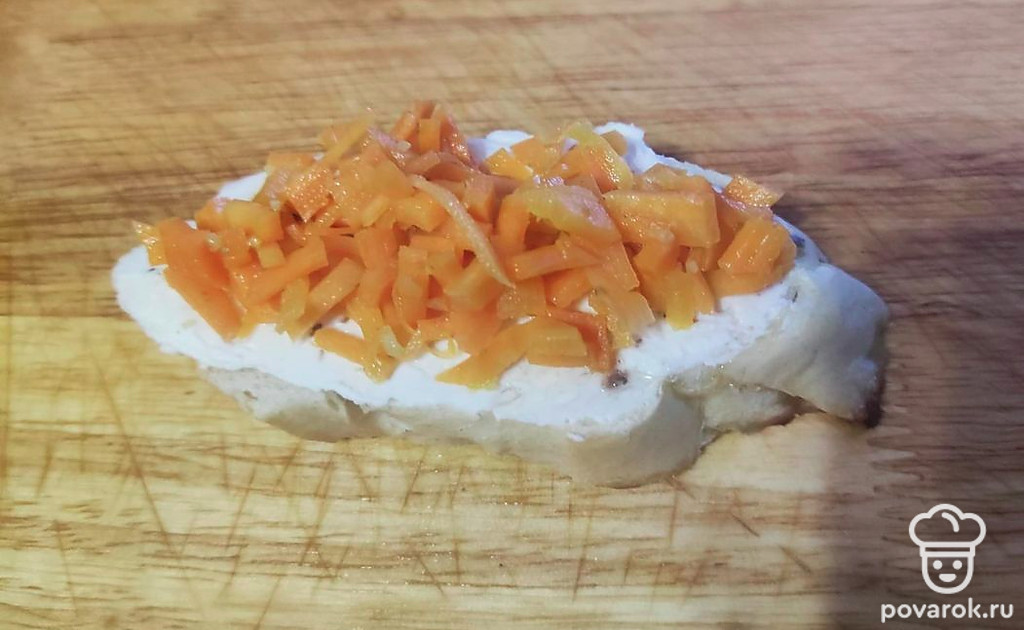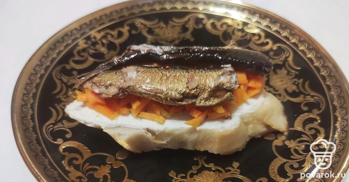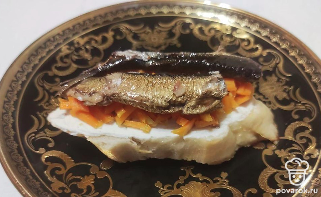 Мелко нарежьте морковь и выложите первым слоем на брускетту, сверху положите шпроты.