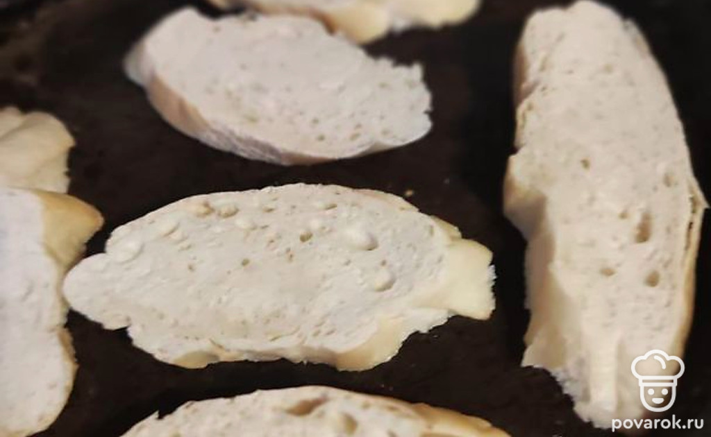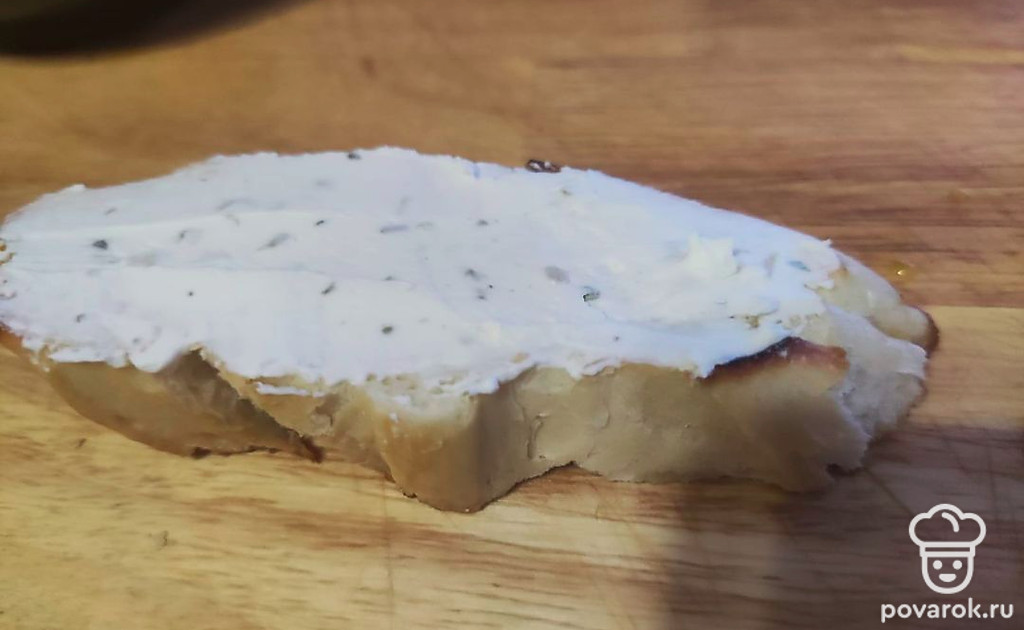 Натрите хлеб чесноком с двух сторон. Намажьте сверху творожным сыром.