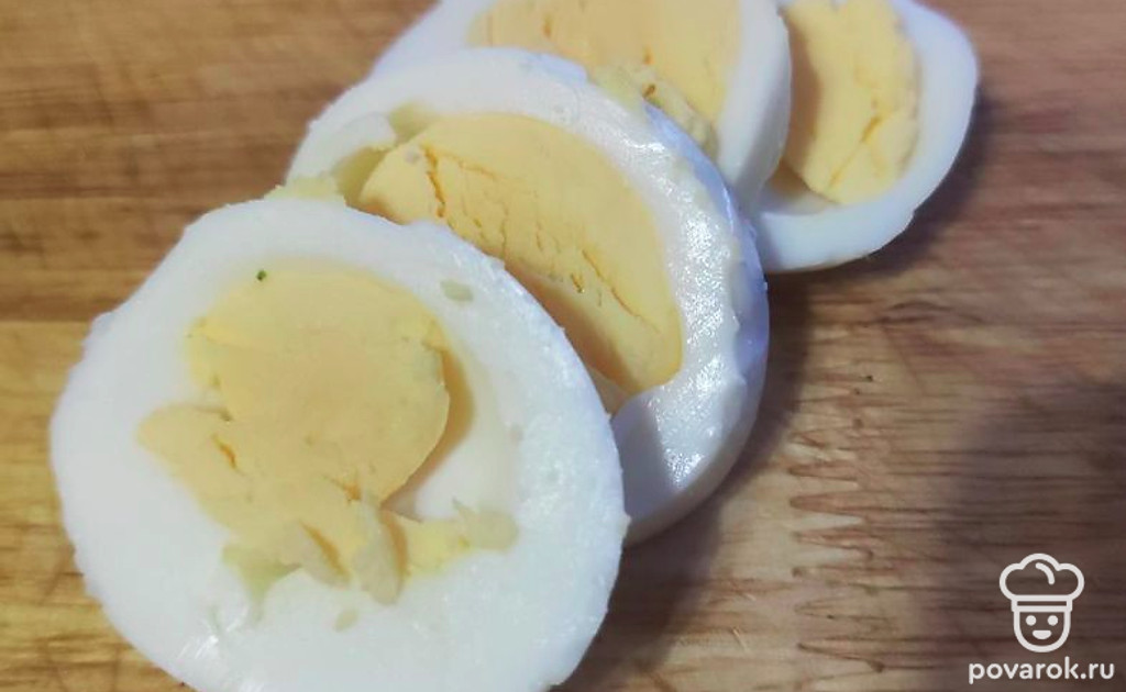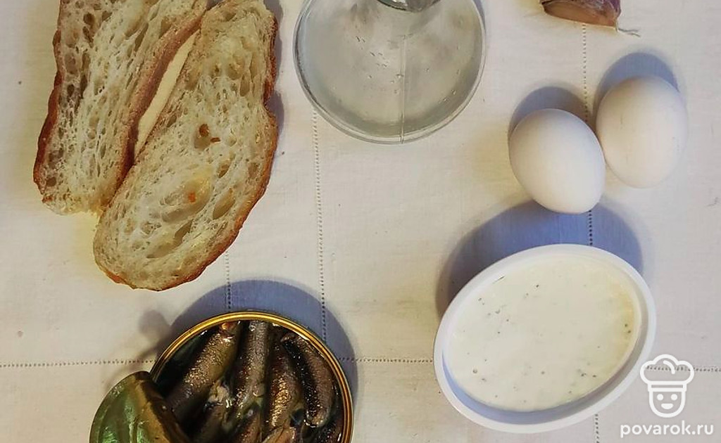 Подготовьте ингредиенты. Разогрейте сковородку, очистите чеснок. Отварите яйца вкрутую.