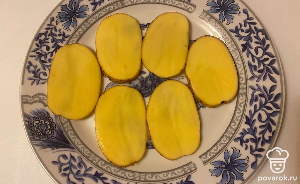 Картофель среднего размера тщательно вымойте и нарежьте на тонкие слайсы.