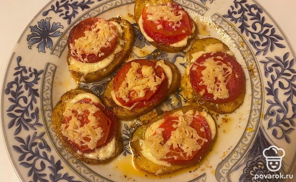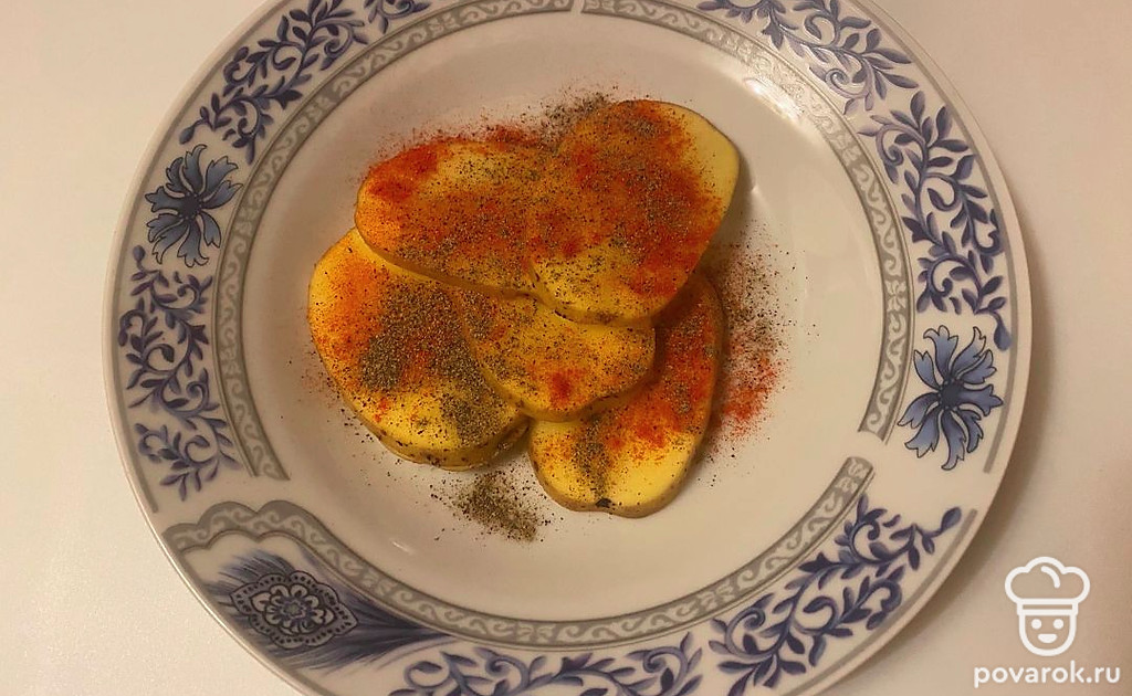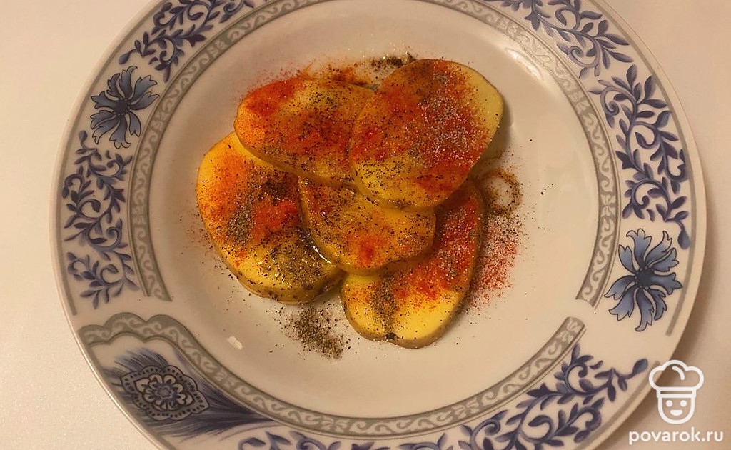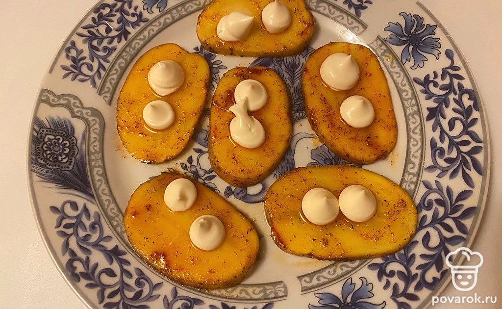 Выложите картошку на плоской и большой тарелке, смажьте каждый ломтик майонезом.