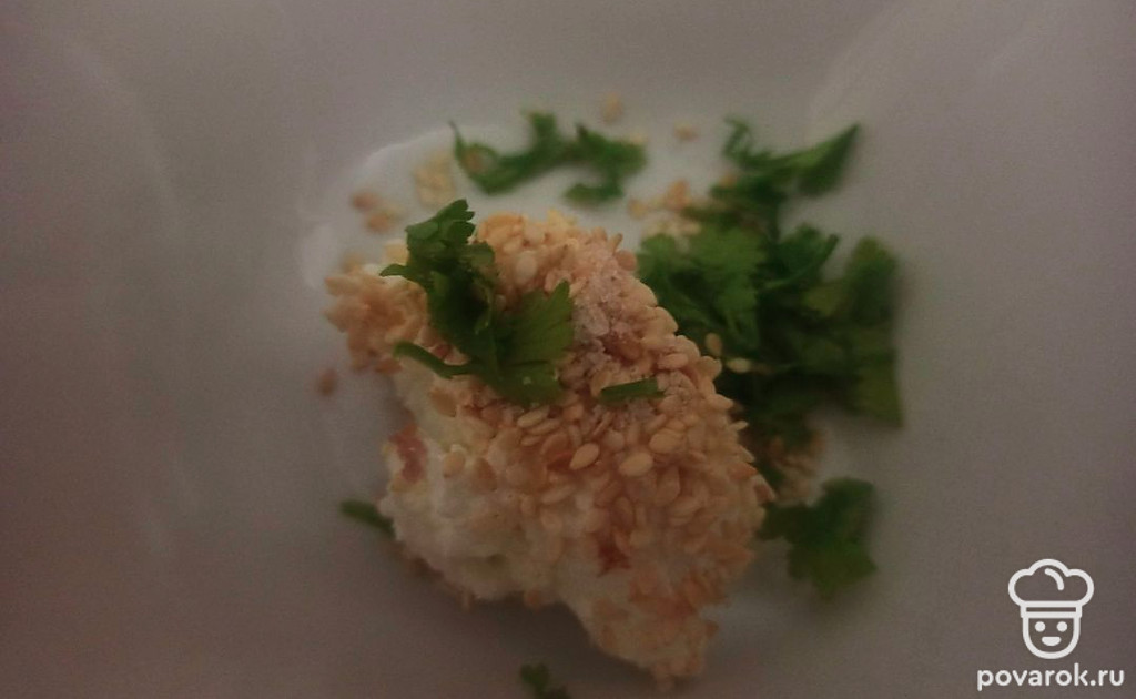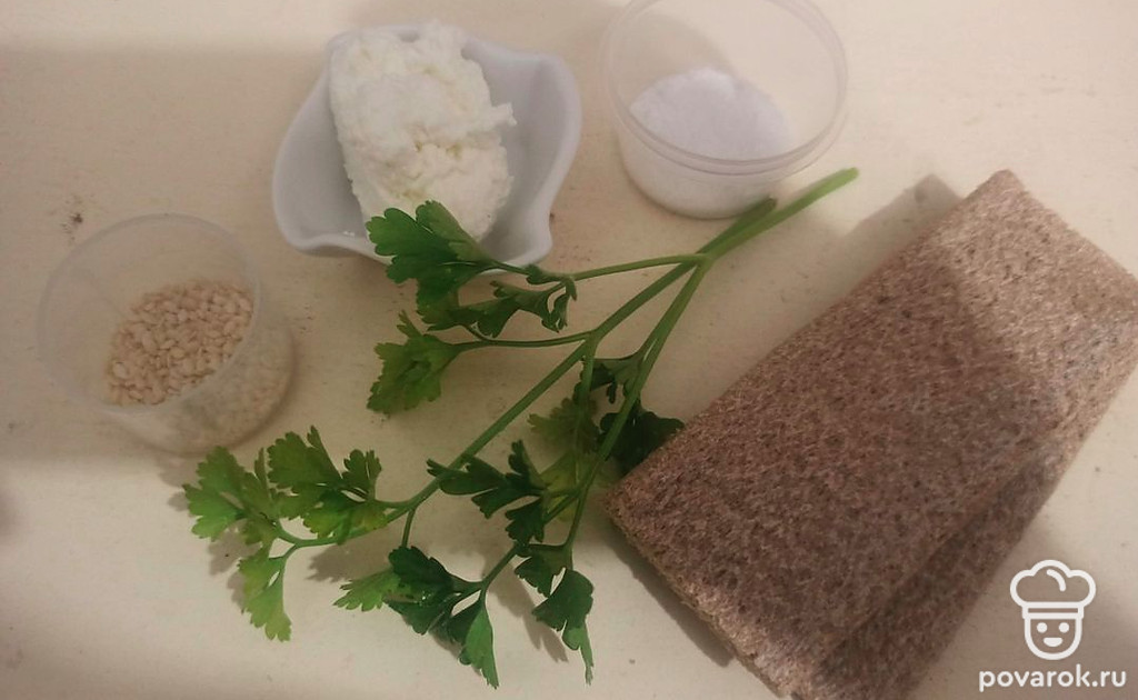 Творог смешайте с жареным кунжутом, петрушкой. Посолите по вкусу.