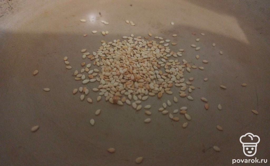 Кунжут обжарьте на горячей сковороде до золотистого цвета в течение 5 минут.