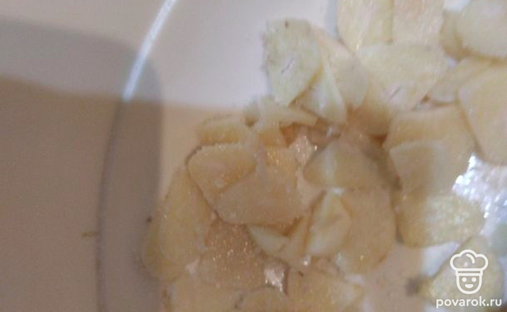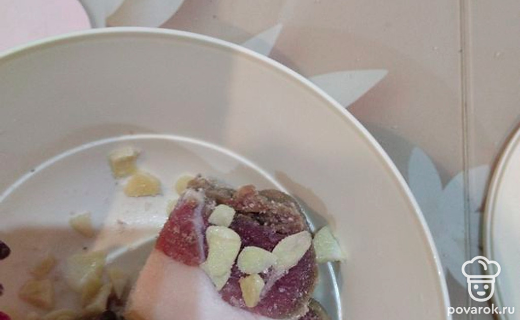 Набиваем щедро куски сала чесноком и солью, можно использовать адыгейскую соль. Оставляем на ночь при комнатной температуре. Затем убираем сало в холодильник на сутки.