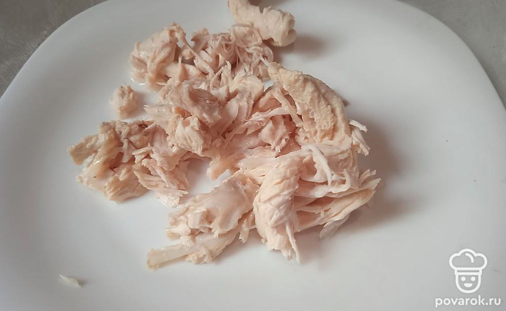 Куриное филе отварите в кипящей подсоленной воде пятнадцать минут. Нарежьте.
