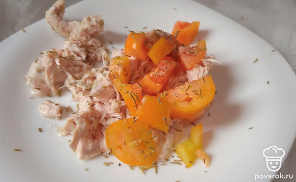 Добавьте нарезанный желтый помидор. Посыпьте сушеным розмарином.