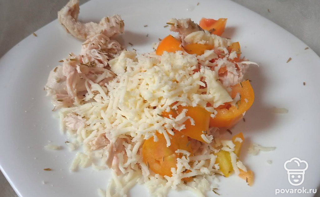 Выложите натертый сыр сулугуни.