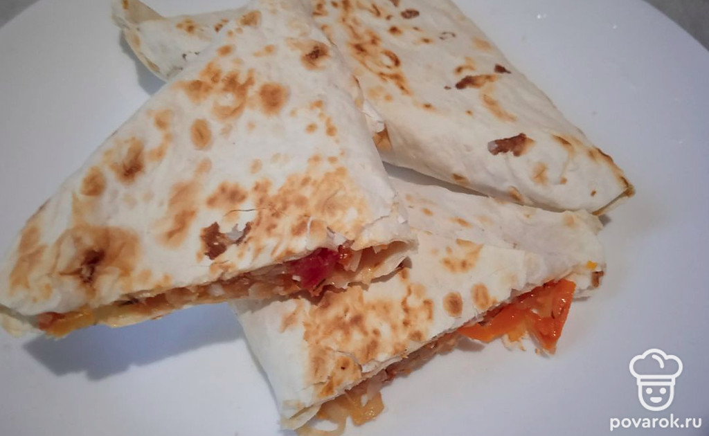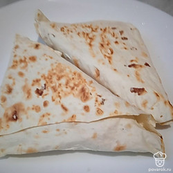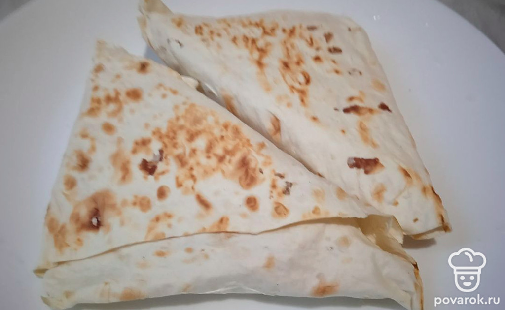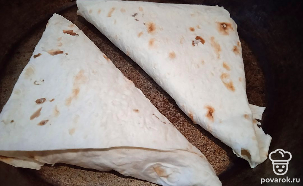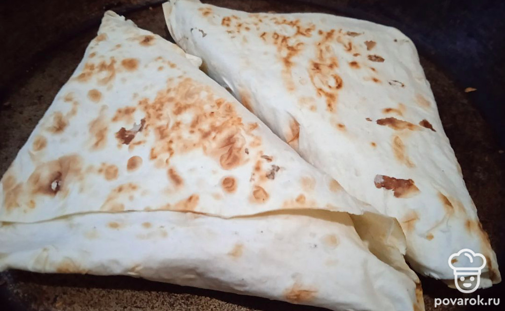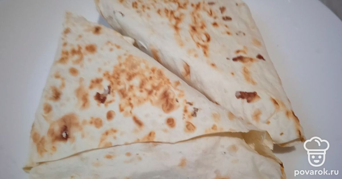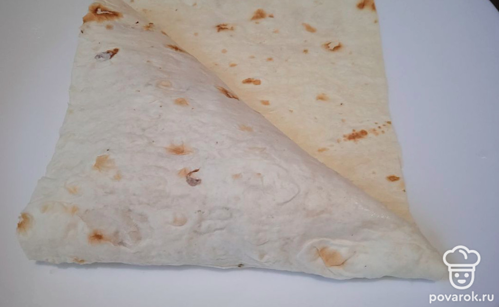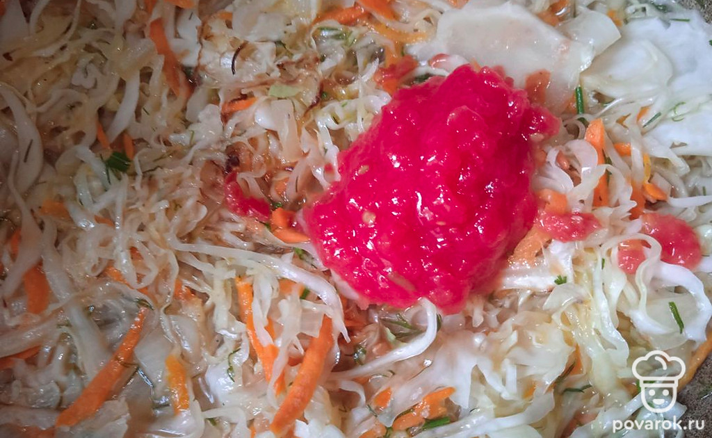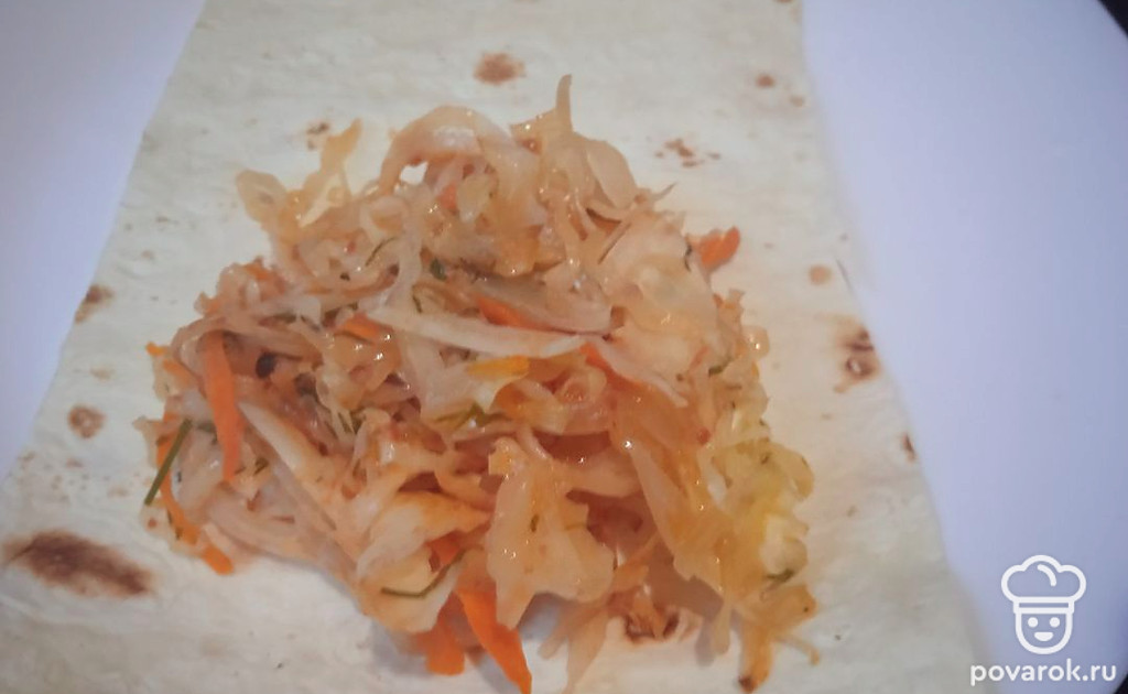 Из листа лаваша нарежьте полоски шириной 10 сантиметров. На каждую полоску положите немного тушеной капусты.