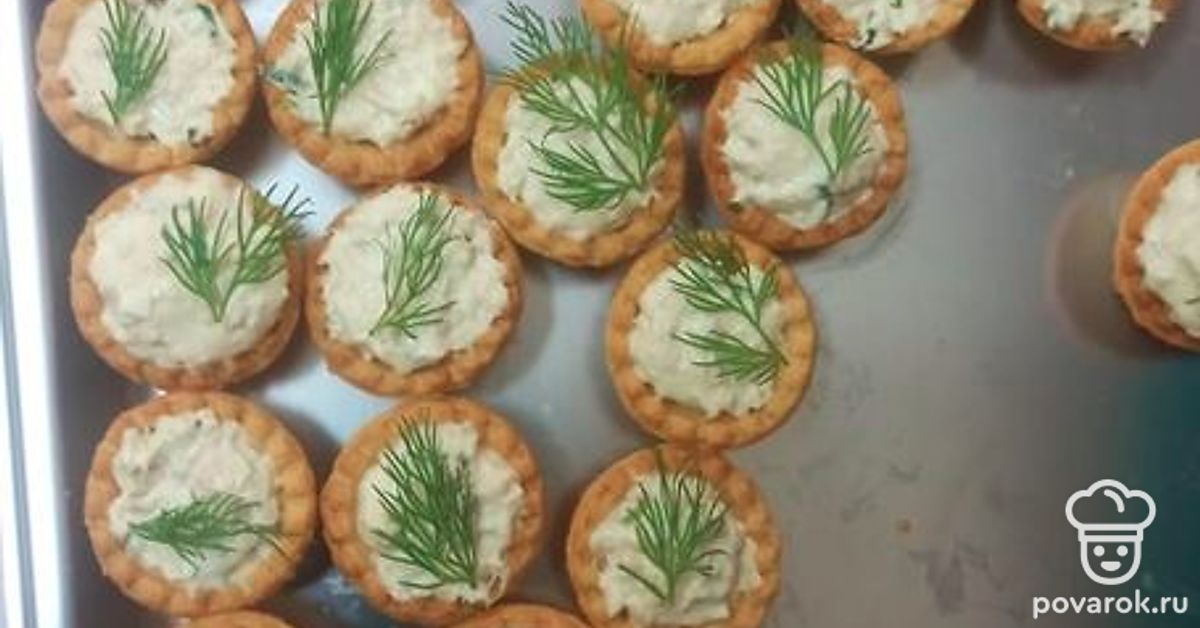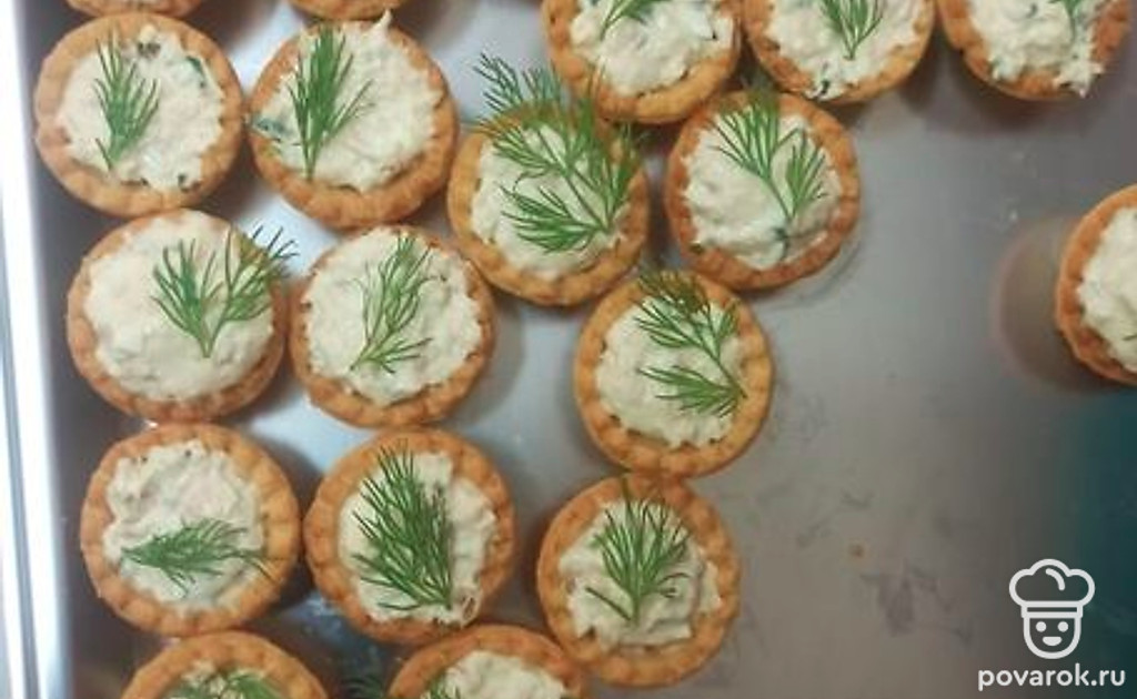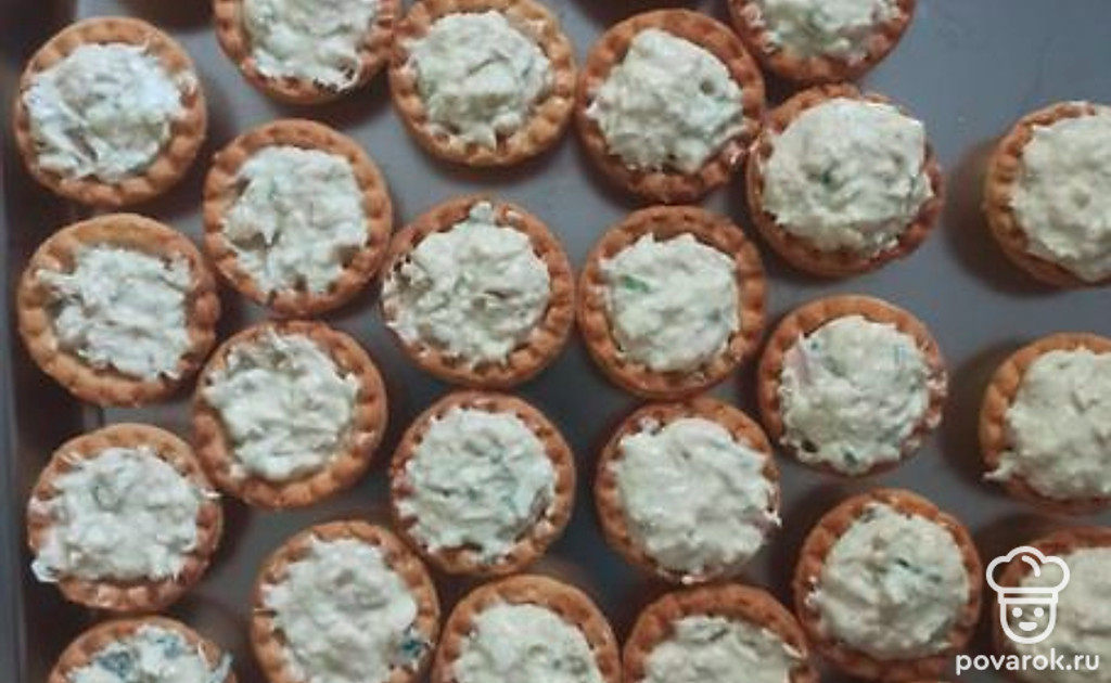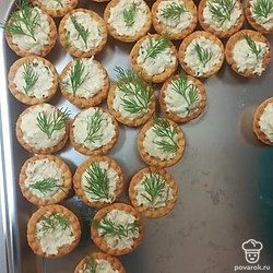 Нежный салат с курицей, королевскими креветками и красной икрой в тарталетках