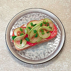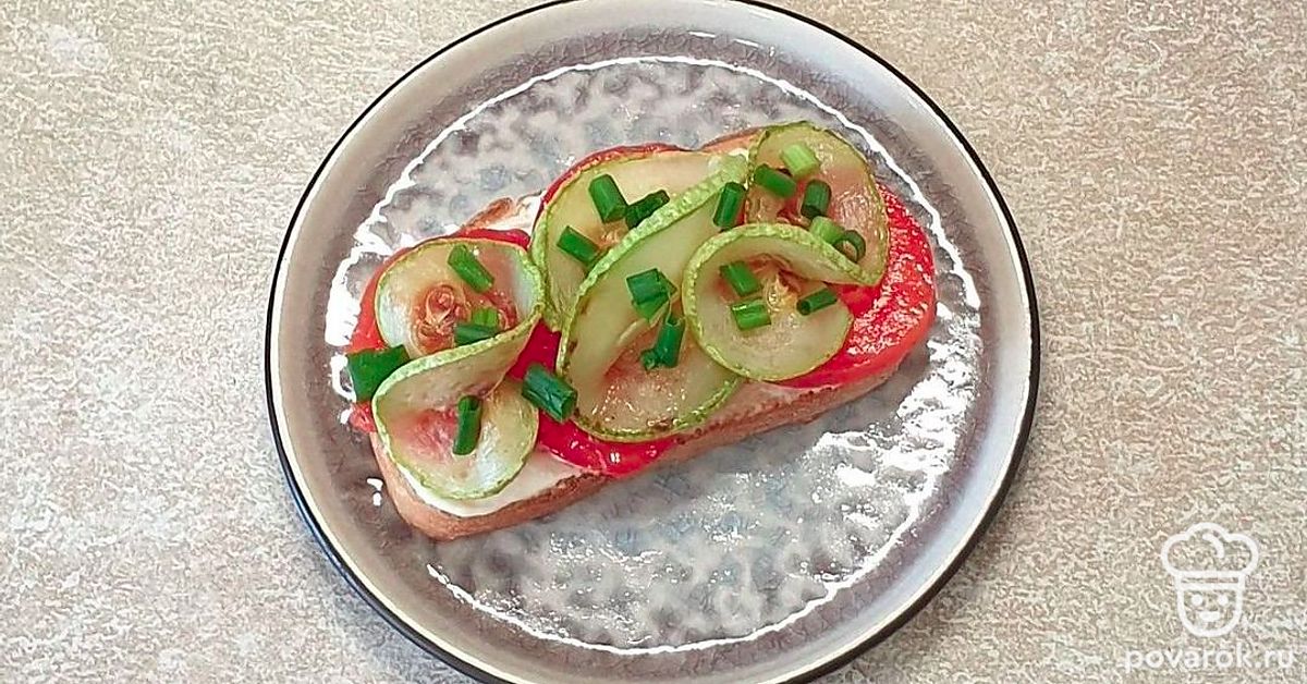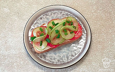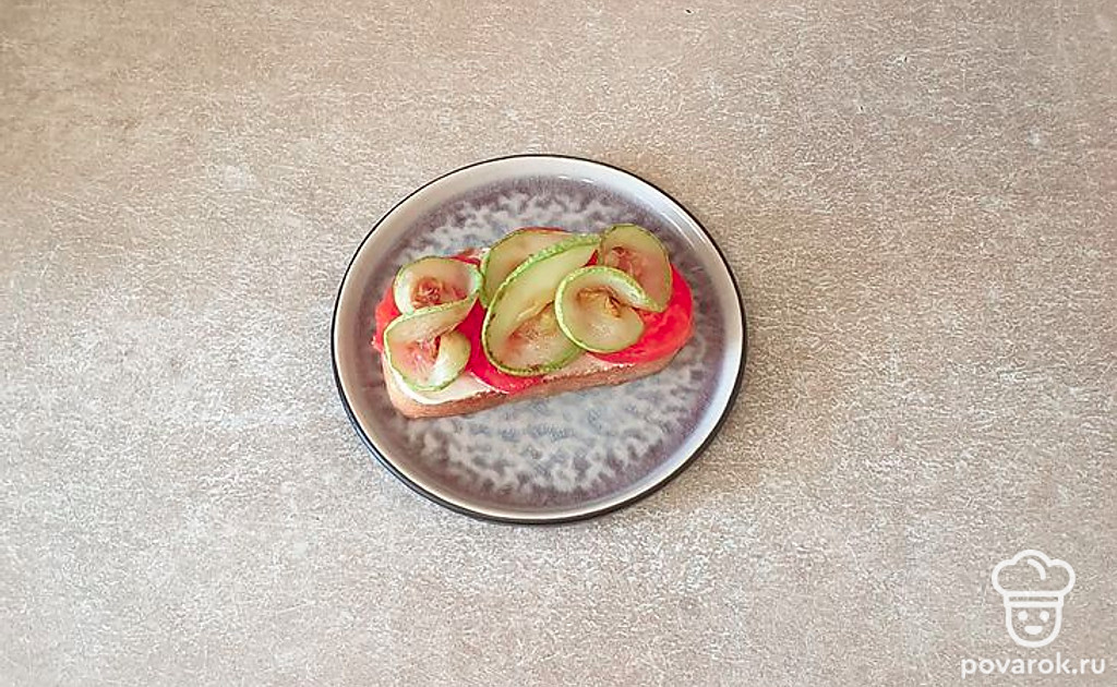 На помидоре красиво разложите обжаренный кабачок.