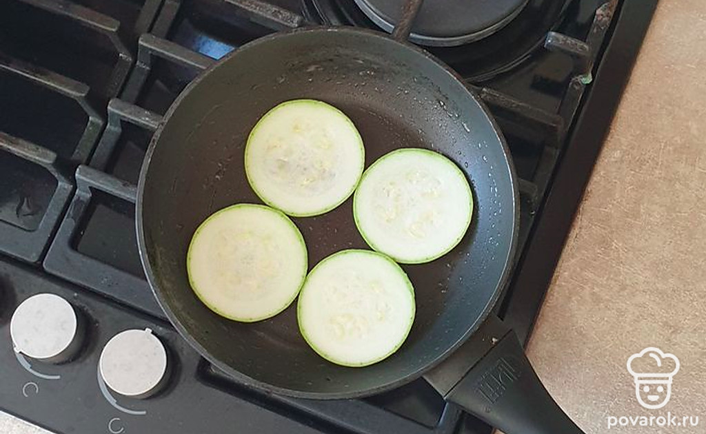 Кабачок нарежьте на тонкие кружочки и обжарьте на среднем огне до мягкости и образования золотистой корочки. В процессе приготовления посолите и накройте крышкой. Так кабачки приготовятся быстрее.