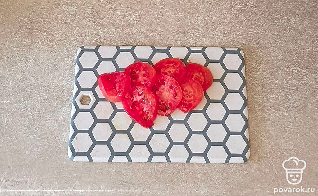 Помидор промойте и тонко нарежьте кружочками.