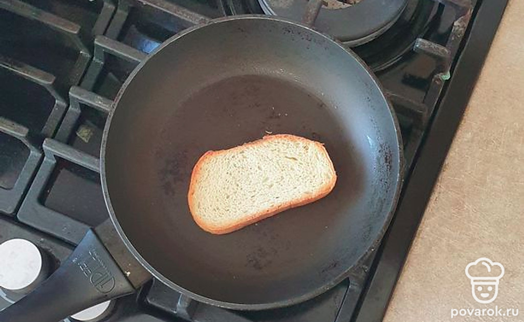 Хлеб обжарьте на сухой сковороде, чтобы он стал хрустящим и приобрел золотистый цвет.