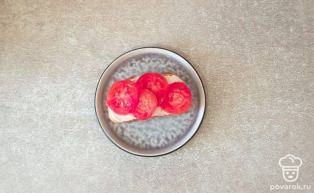 Сверху выложите нарезанный помидор и слегка посолите.